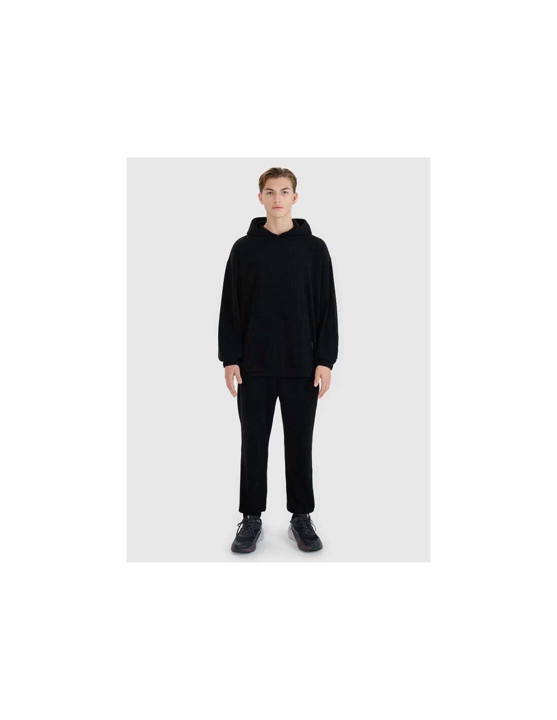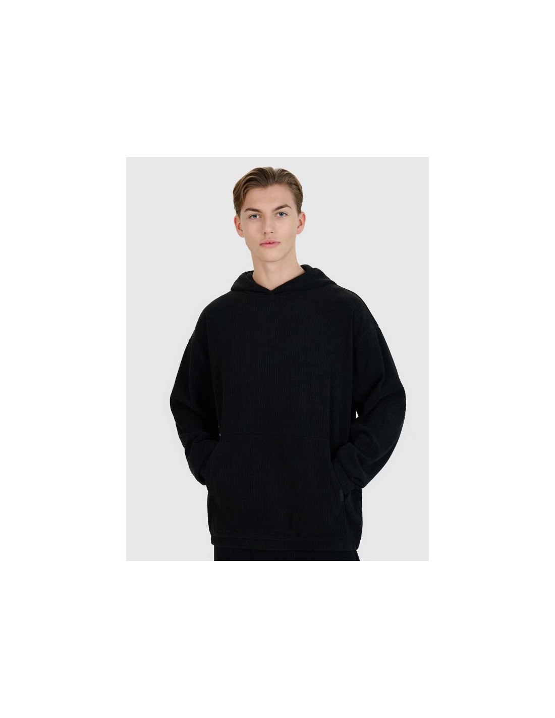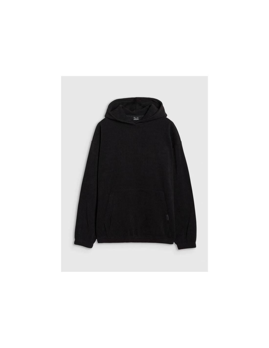 Men's hoodie 4F This men's hooded sweatshirt is a perfect choice for both casual and sporty outfits. Made of durable knit fabric with a corduroy-like texture, it stands out for its fashionable look and high functionality. Thanks to its oversized cut, the sweatshirt fits loosely on the body, ensuring complete freedom of movement. The high 385 gsm weight makes the material thicker, more durable, and resistant to deformation, allowing you to enjoy its shape for many seasons. The unlined construction makes it lighter and more comfortable for everyday wear. This model features an integrated hood , a practical kangaroo pocket at the front, and elastic cuffs and hem for a better fit and increased thermal comfort. It slips on over the head – a classic and versatile solution. The most important features of the sweatshirt: Weight: 385 gsm – thick, durable fabric. Cut: oversize – loose and casual style. Length: standard, hip-length. Material: synthetic – durable and easy to care for. Structure: knit fabric imitating corduroy. Size range: S–XXL. Hood: integrated at the neckline. Pocket: open kangaroo pocket at front. Finishing: elastic cuffs and hem with drawstring. Colors: uniform – easy to combine in styles.