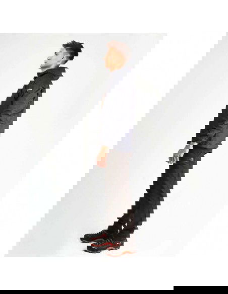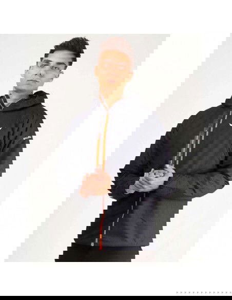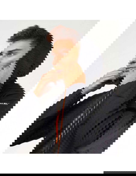 Πρώτον, το εξαιρετικά διαπνέον εξωτερικό ύφασμα 2,5 στρώσεων (στήλη νερού: 10.000 mm, MVTR: 40.000 g/m²/24h) παρέχει αξιόπιστη προστασία από τις καιρικές συνθήκες και επιτρέπει έναν ελαφρύ σχεδιασμό. Του προσδίδουμε φινίρισμα DWR (ανθεκτικό υδατοαπωθητικό) χωρίς PFC και συγκολλημένες ραφές.