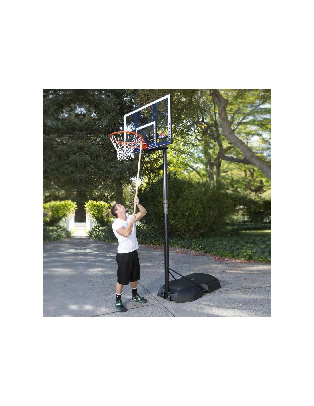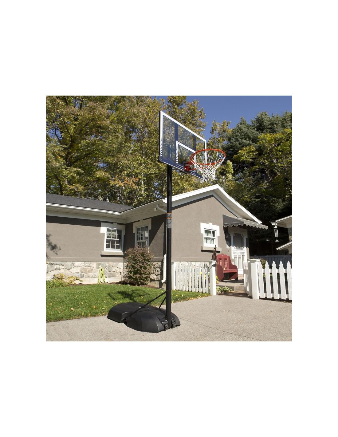 Η φορητή βάση μπάσκετ διαθέτει ταμπλό 44" κατασκευασμένο με τεχνολογία Steel-Framed Shatter-Proof. Η τεχνολογία Shatter-Proof εγγυάται μακροχρόνια ανθεκτικότητα και αντοχή στα χτυπήματα χάρη στην επίστρωση από πολυκαρβονικό Makrolon® υψηλής ποιότητας. Η τεχνολογία Steel-Framed είναι ένα ανθεκτικό χαλύβδινο πλαίσιο για την πλάτη του ταμπλό. Η πρόσθετη προστασία της κάτω άκρης του ταμπλό και η τεχνολογία ρύθμισης του ύψους του ταμπλό Quick Adjust® II εξασφαλίζουν άνετο και ασφαλές παιχνίδι σε κάθε επίπεδο παιχνιδιού, χάρη στη ρύθμιση στο εύρος από 244 έως 305 cm. Το αδιάβροχο νάιλον πλέγμα και ο στρογγυλός στύλος με διάμετρο 7,6 cm Τα ρολά μεταφοράς που είναι τοποθετημένα σε μια σταθερή βάση γεμάτη νερό χωρητικότητας 128 λίτρων εξασφαλίζουν την πλήρη κινητικότητα και σταθερότητα της βάσης.