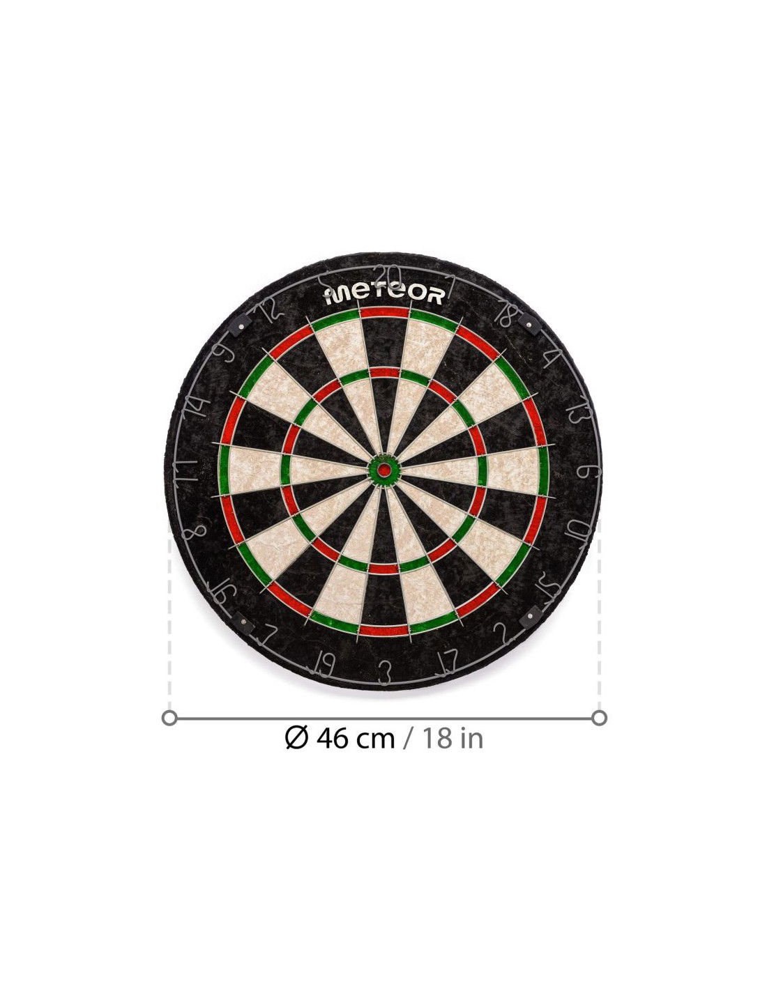 METEOR SISAL DART BOARD 18" Properties: Classic dart board Material: sisal fiber Single-sided shield Dial diameter: 18'' (46 cm) Shield weight: 3.5 kg Set weight: 3.8 kg Equipped with a metal ring Package dimensions: 45 x 45 x 5 cm