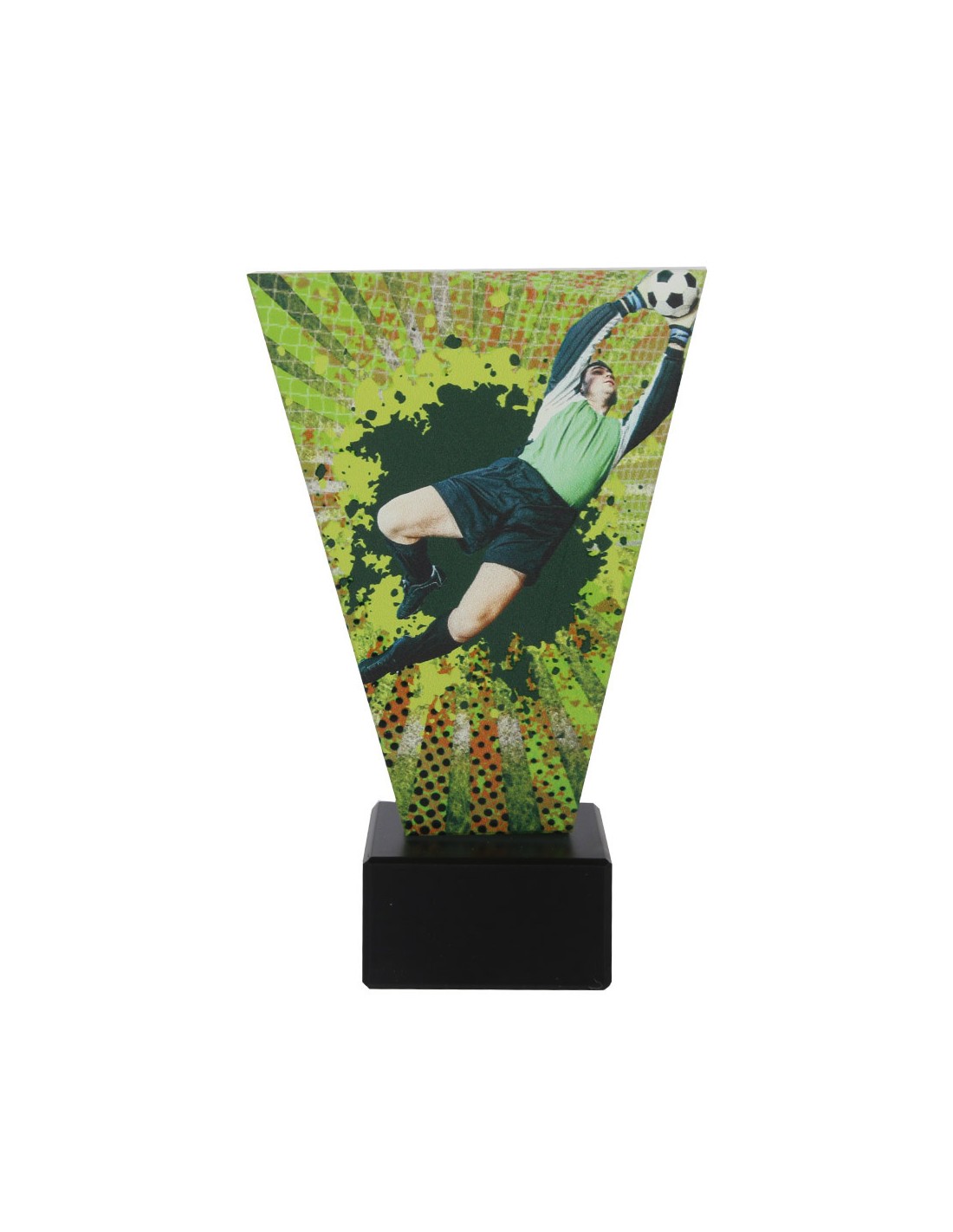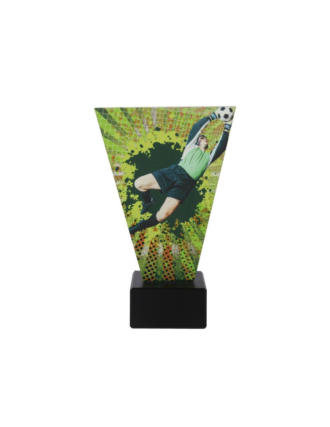 Το γυάλινο τρόπαιο έχει ύψος 10 ίντσες και παρουσιάζει έναν ποδοσφαιριστή σε δράση, κρατώντας μια μπάλα. Είναι το ιδανικό βραβείο για αθλητικά γεγονότα, διοργανώσεις ή τουρνουά ποδοσφαίρου.