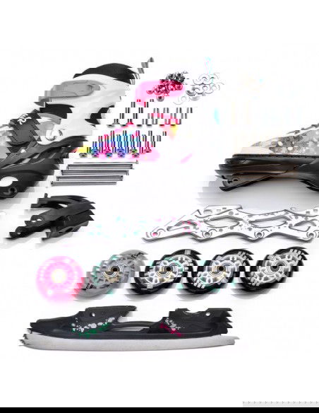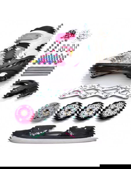 • 4-in-1 system: inline skates, ice skates, roller skates, roller skates