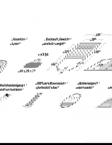 - Το flysheet έχει ενισχυθεί με επίστρωση αλουμινίου, η οποία μειώνει τη θερμότητα στο εσωτερικό κατά 17% και συμβάλλει στην προστασία από τις ακτίνες UV σε επίπεδο 80.
