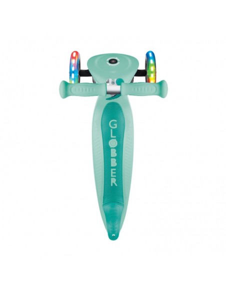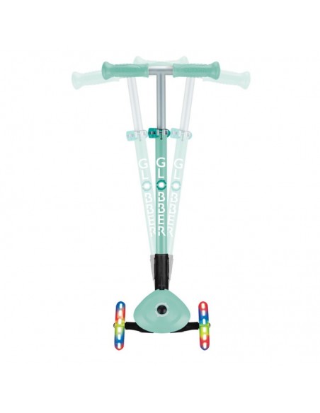 Το PRIMO FOLDABLE LIGHTS διαθέτει το πατενταρισμένο σύστημα κλειδώματος τιμονιού της Globber, το οποίο κλειδώνει τους μπροστινούς τροχούς του σκούτερ ώστε να κινούνται μόνο προς τα εμπρός και προς τα πίσω, έτσι ώστε τα παιδιά να αποκτήσουν αυτοπεποίθηση κατά την οδήγηση του σκούτερ τους, εξασκώντας παράλληλα τις δεξιότητες ισορροπίας τους. Για να μεταβείτε σε πλήρη λειτουργία οδήγησης και να ενεργοποιήσετε την οδήγηση με βάση την κλίση, απλά απελευθερώστε το κουμπί κλειδώματος του τιμονιού που βρίσκεται στη βάση του καταστρώματος του σκούτερ.