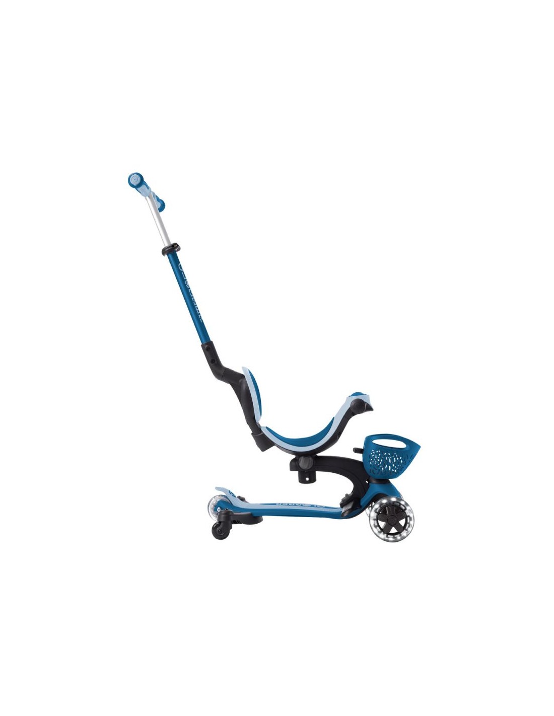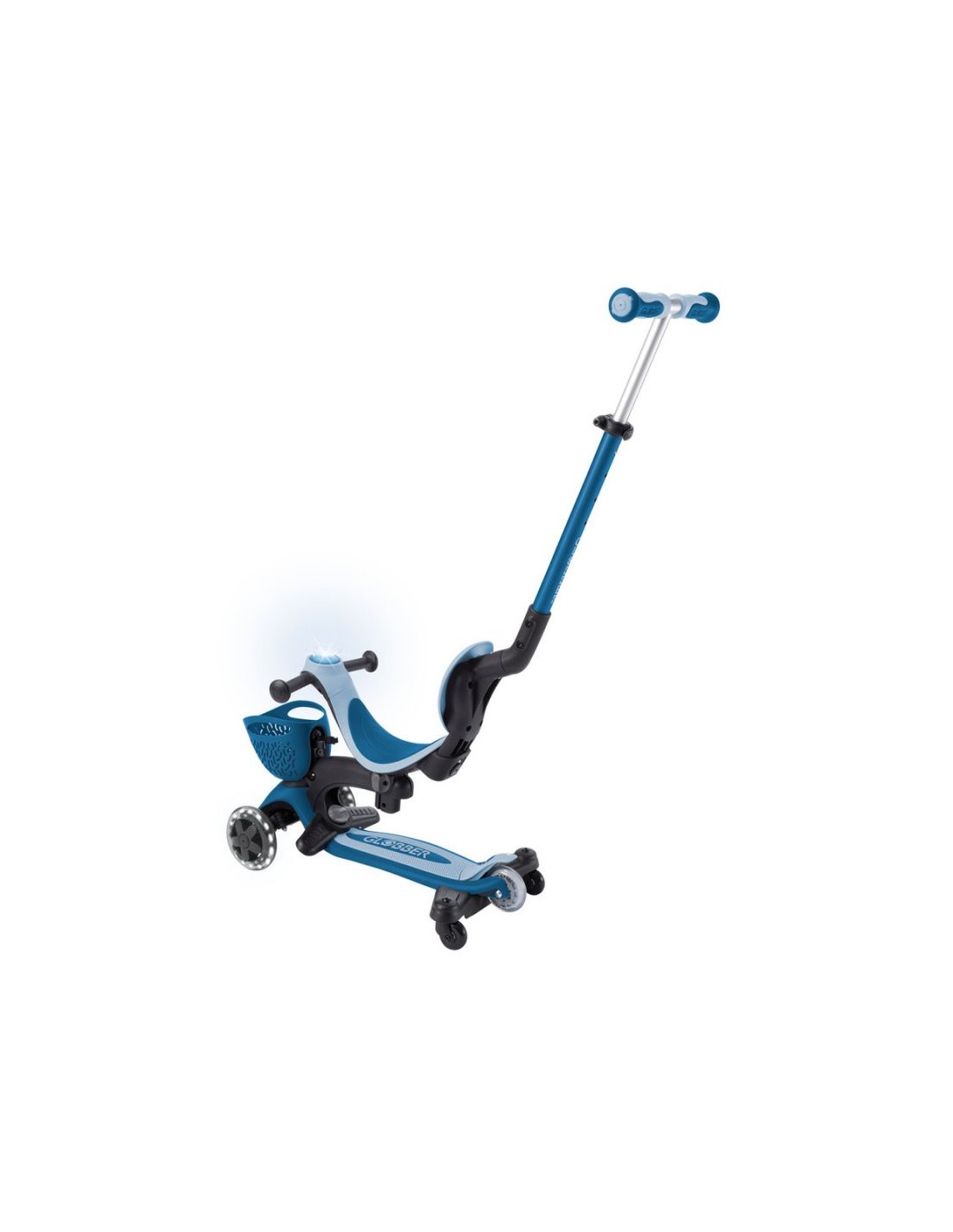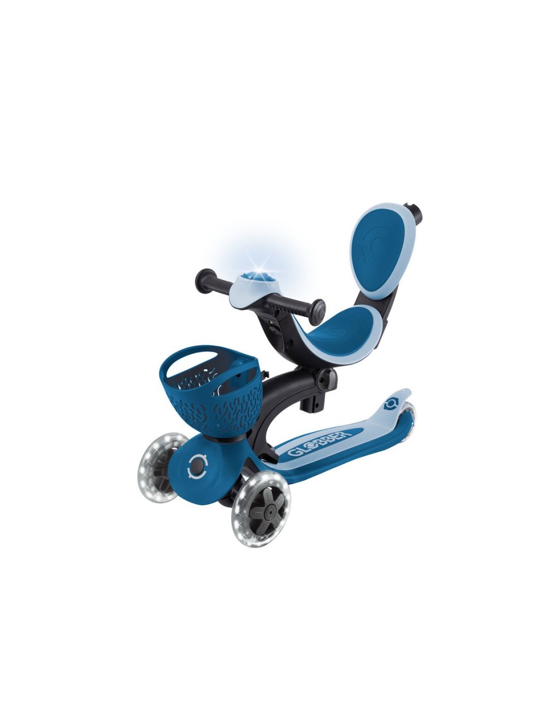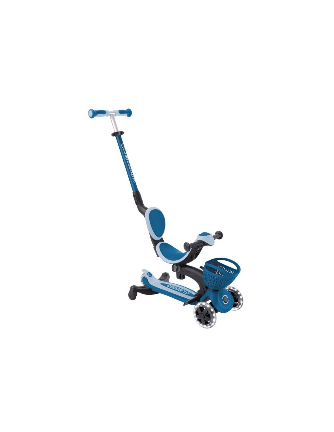 GO • UP BABY LEARN 360 FLASH LIGHTS A multi-functional all-in-one ride-on vehicle with a seat for small children, made from recycled TBC plastic, featuring light-up wheels, a light on the handlebar, a basket, a backrest and side wheels. The vehicle offers 3 modes: ride-on car with handle for parents (15 months - 3 years) tricycle - balance bike (15 months - 3 years) scooter with 3-level height adjustment and foldable structure (3-6+ years) Simple, tool-free and intuitive transformation between modes using a solidly designed combination of buttons and knobs. The patented folding system allows for convenient transport and storage of the vehicle. The patented steering lock system allows for straight-line driving only. This option is useful for beginners; once your child has mastered balance, you can restore full control with a single button. The vehicle is equipped with light-up wheels that flash white while driving and does not require the use of any batteries. Made from 100% recycled TBC plastic (in reusable components). 100% tool-free design 100% tool-free design lets you easily switch between different modes without tools or screws – the GO • UP features spring-loaded buttons and knobs that allow for a seamless transition from ride-on to scooter mode. Solid platform and durable wheels with LED diodes GO • UP Active Lights ECOLOGIC is equipped with a low, metal-reinforced structure that can withstand up to 50 kg and a wide, non-slip composite deck for a safe scooter ride. High-quality, high-rebound, 121mm diameter PU-molded front wheels mounted on ABEC 5 bearings and an 80mm diameter PU-molded rear wheel provide a smooth ride. The front wheels are equipped with LED lights that flash white while riding. Batteries are not required for the wheels. Patented steering lock system The GO • UP Baby features Globber's patented steering lock system, which locks the scooter's front wheels to only move forward and backward, so kids gain confidence while scootering while developing their balance skills. To enter full steering mode and enable balance steering, simply release the handlebar lock button located at the front of the scooter. Patented folding system Effortlessly carry and store your GO • UP Baby in a compact form! Featuring a patented folding system, easily fold this 3-wheel scooter into stroller mode to carry it around or roll it after a day of scootering fun. Amenities for the best comfort TPR saddle with 3-step height adjustment and comfortable backrest. Footrest - The removable footrest provides additional comfort and safety when riding in ride-on mode. It allows the feet to rest securely while the parent controls the vehicle. The basket at the front of the scooter can be detached when not needed. Light module on the handlebar - exclusive LED light with vibration function. Light-up wheels - the front wheels of the vehicle are equipped with LEDs that flash white while driving. Side wheels – additional rear wheels with 360-degree rotation – make it easier for parents to control the ride-on. They can be easily removed when not in use. Adjustable height on 3 levels - easy and quick adjustment of the parent handlebar height and handlebar height in scooter mode