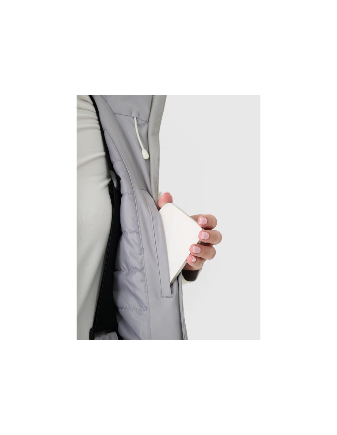 The 4F women's ski jacket features a NeoDry 5000/3000 membrane , which ensures the jacket is waterproof in light rain or snow, while also providing optimal moisture management for urban use. This everyday ski jacket has a regular fit and covers all the basics of moisture protection. The recycled materials are IRR-treated, making them water and dirt repellent. It's windproof, waterproof, and breathable thanks to taped seams. Compared to natural down, synthetic down filling is more durable and easier to care for. Even when wet, it retains warmth much longer and dries relatively quickly compared to natural down. Furthermore, it requires less complicated washing and drying. cut: regular, which comfortably fits the figure standard cut reaching to the hips polyester, quilted lining the hydrophobic coating of the outer material limits the absorption of moisture taped critical seams in the hood and shoulders integrated hood with a profiled visor and adjustable volume and depth high collar cuffs with Velcro adjustment 2 side pockets with zipper closure internal, open mesh goggle pocket internal Velcro pocket ski pass pocket on the left arm one-way main zipper with internal wind flap bottom circumference adjustment using a tunnel drawstring with stoppers synthetic down filling provides adequate insulating properties even in humid conditions NeoDry 5000/3000 membrane protects against light rain or snowfall