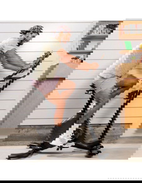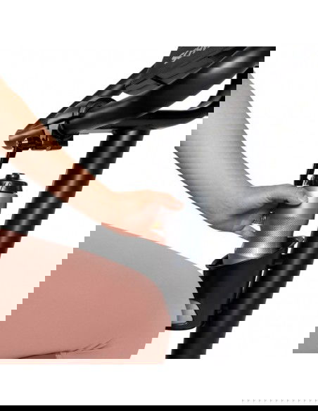 - Το ποδήλατο έχει εξοπλιστεί με όλα τα απαραίτητα αξεσουάρ και πρόσθετα που θα κάνουν την προπόνηση ευχάριστη και άνετη, όπως η δυνατότητα προσαρμογής της ρύθμισης του τιμονιού, ηχεία, θύρα USB με δυνατότητα φόρτισης συσκευών, θήκη για tablet, θήκη για μπουκάλι νερού, ρόδες μεταφοράς για άνετη μετακίνηση του εξοπλισμού και τεχνολογία Bluetooth, η οποία επιτρέπει, για παράδειγμα, τη σύνδεση της συσκευής με ασύρματη ζώνη τηλεμετρίας για ακριβή μέτρηση των καρδιακών παλμών κατά τη διάρκεια της προπόνησης. Η θήκη για το μπουκάλι έχει τοποθετηθεί σε σημείο από το οποίο μπορείτε να βγάζετε εύκολα το μπουκάλι κατά την οδήγηση.