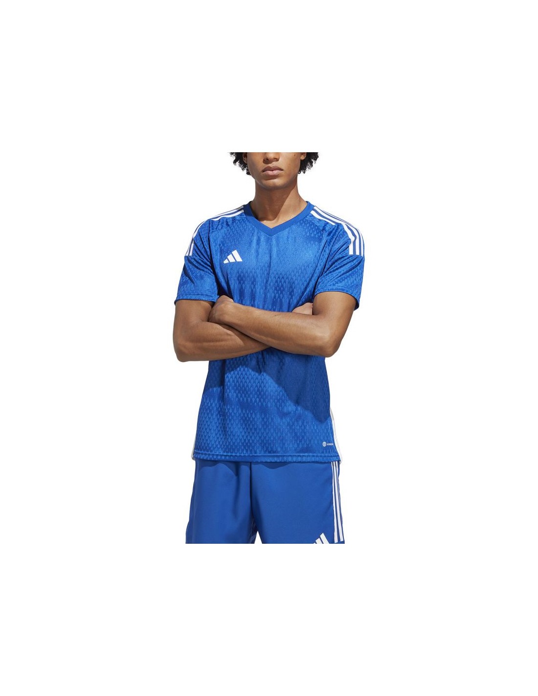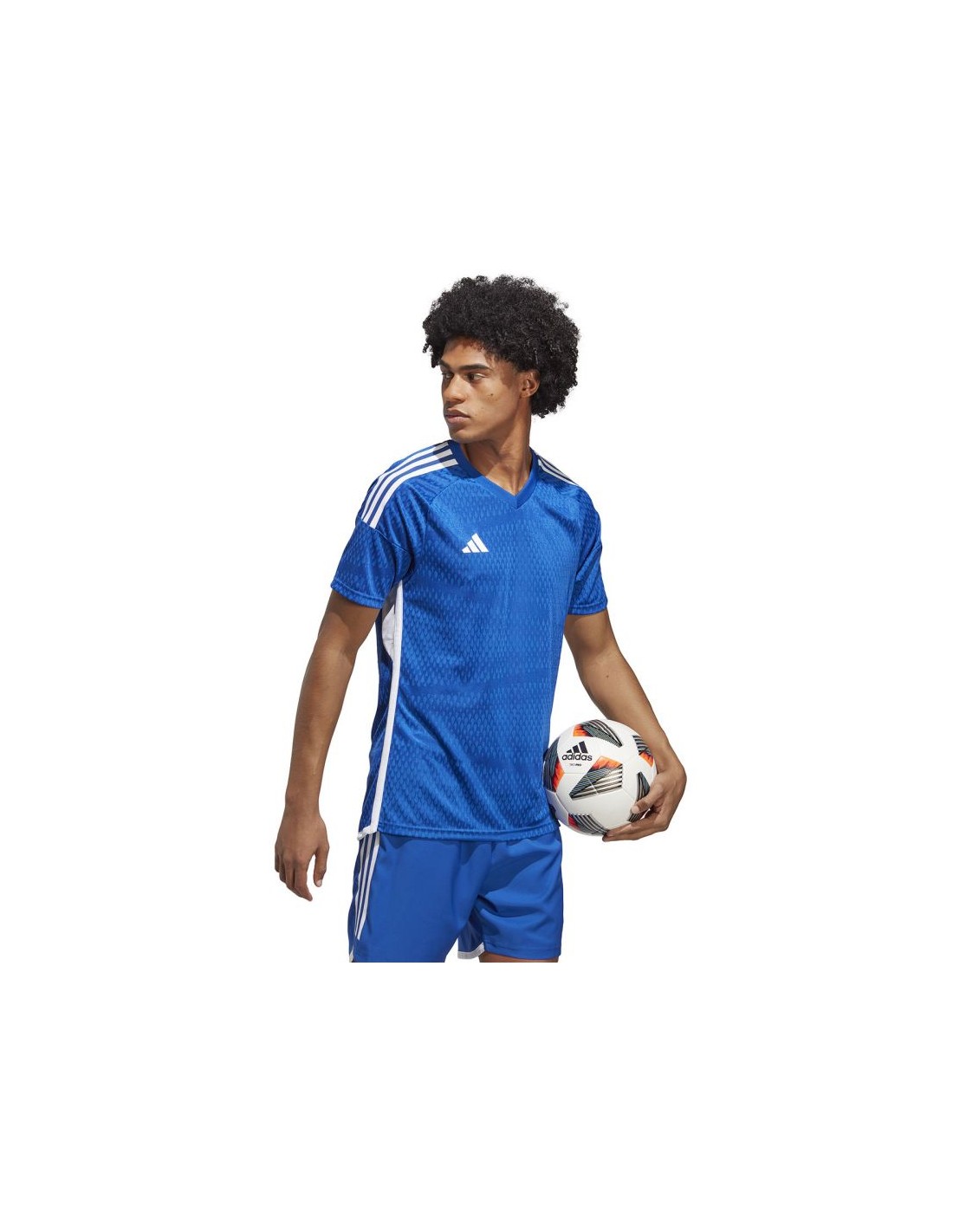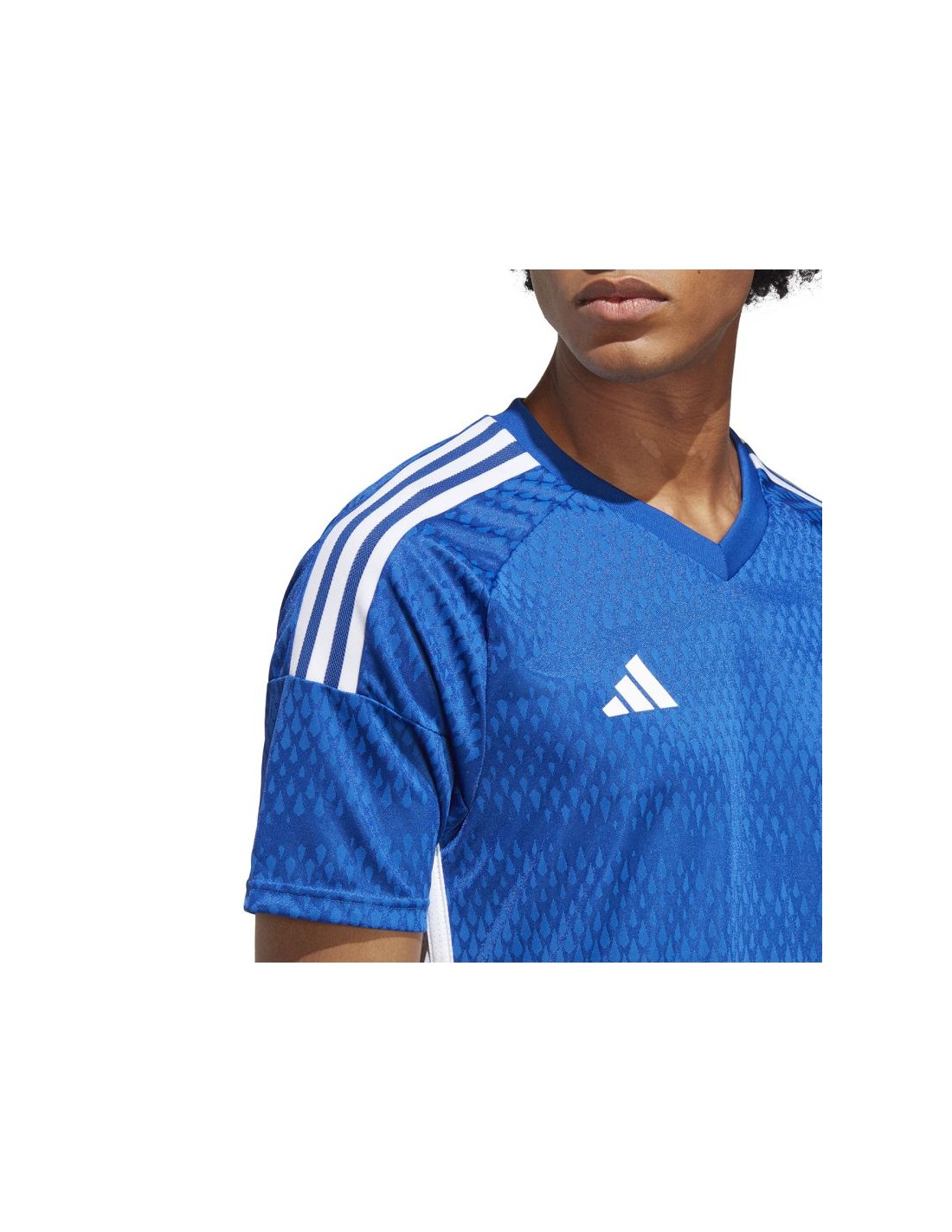 Men's adidas Tiro 23 Competition Match Jersey, Blue HT5684. This adidas men's jersey is perfect for football matches. Slim fit. V-neck. Mesh underarm panels. Aeroready technology wicks away excess moisture. Recycled fibers. Material: 100% recycled polyester
