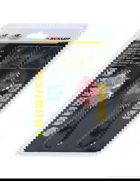 Σετ πίσω + μπροστινά φώτα ποδηλάτου LED Dunlop 2053141 Το σετ φώτων Dunlop θα λειτουργήσει καλά κατά την οδήγηση ποδηλάτου, σκούτερ ή κατά τη διάρκεια άλλων δραστηριοτήτων. Το μπροστινό φως εκπέμπει έντονο λευκό φως και το πίσω φως εκπέμπει κόκκινο φως. Τα δύο φώτα διαθέτουν δύο διόδους LED με τρεις λειτουργίες φωτισμού. Αδιάβροχες ιδιότητες. Καθολική τοποθέτηση σε ελαστική ταινία. Το σετ περιλαμβάνει τρεις μπαταρίες. Τεχνικά στοιχεία: - Διαστάσεις της λάμπας: - Χρώμα: Λευκό, κόκκινο - Βραχίονας στήριξης: γενικής χρήσης - Υλικό: 1,5 cm (ύψος x πλάτος): Υλικό: Πλαστικό, σιλικόνη - Φωτισμός: Φωτισμός: 1x LED σε 1 λαμπτήρα - 3 λειτουργίες φωτισμού: συνεχής, παλλόμενος, αναβοσβήνει Πιστοποιητικό CE: ναι: 3 x CR1220, περιλαμβάνεται