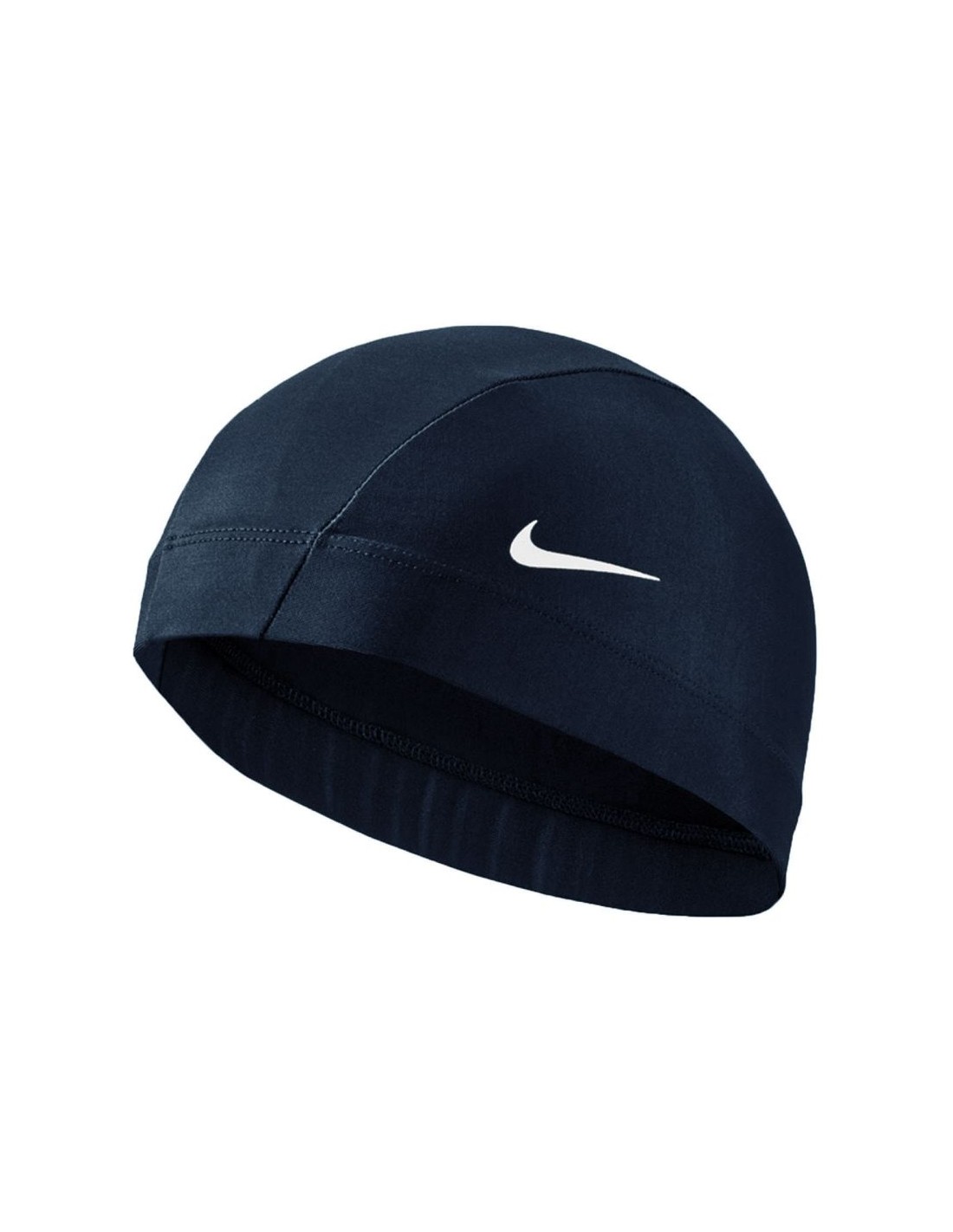 Nike Os Comfort Navy Blue Swim Cap NESSC150-440. When putting together your pool gear, it's worth remembering a Nike swim cap. The stretchy material conforms to the shape of your head, allowing for easy donning and doffing without pulling hair. Wider band at the bottom. Three-piece construction. Subtle logo. Material: 82% polyester, 18% elastane