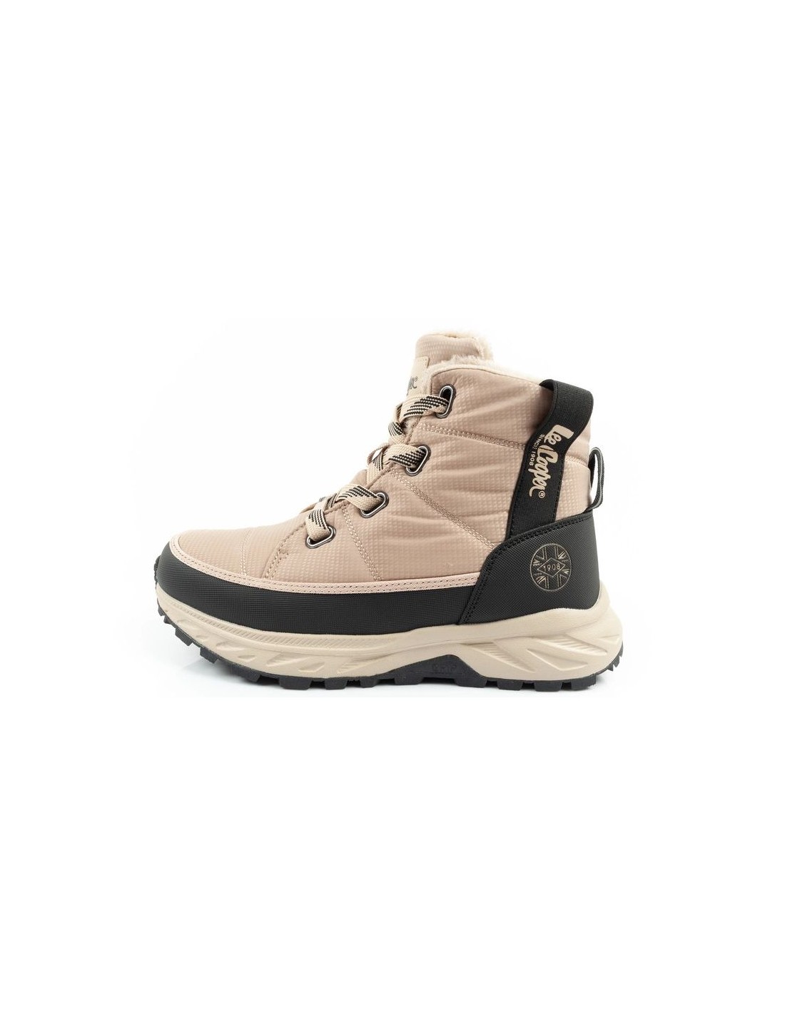 Lee Cooper women's winter hiking shoes, insulated, beige, black Insulated winter boots for women. The upper is made of the highest quality textile and synthetic material, which should be impregnated before use to provide the shoes with additional protection against moisture. Soft inner insulation effectively protects against the cold, and the raised upper stabilizes the ankle and increases comfort. The thick, fully cushioned outsole ensures comfort on every walk. The lacing system used in the shoes ensures a perfect fit to the foot. The perfect footwear for any fashionable style. Hiking boots from Lee Cooper. The universal design of Lee Cooper shoes is perfect for both casual and sporty styles. These are shoes that will work well in autumn and winter conditions, guaranteeing warmth, comfort and a fashionable look.