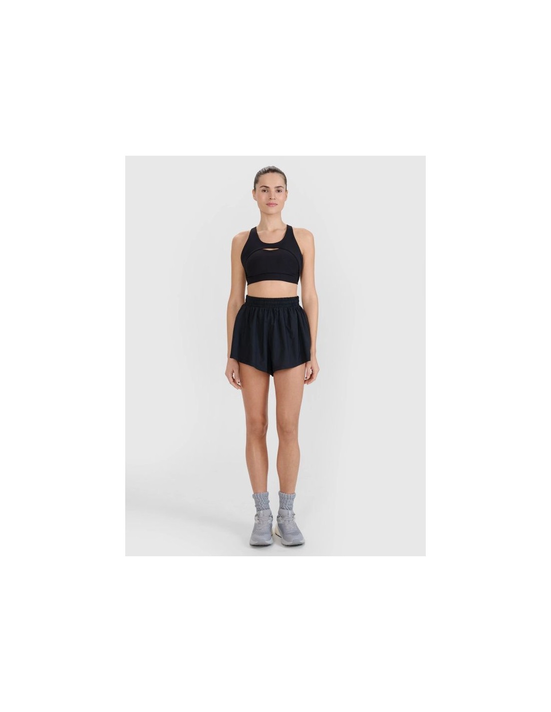 Women's 4F quick-drying training shorts – lightness and efficiency 4F's quick-drying women's training shorts are perfect for active women who demand functionality , comfort , and minimalist style. These black shorts are perfect for intense workouts , the gym, or everyday activities. Product features: Material: 100% polyester , light and durable Technology: 4FDry – a quick-drying finish that effectively wicks away moisture and keeps you feeling dry Cut: Regular fit with a high waist – ensures comfort and stability during movement Waistband: Elastic , with internal or external drawstring adjustment for a personalized fit Pockets: no pockets, minimalist design Color: black , a universal choice for any training style
