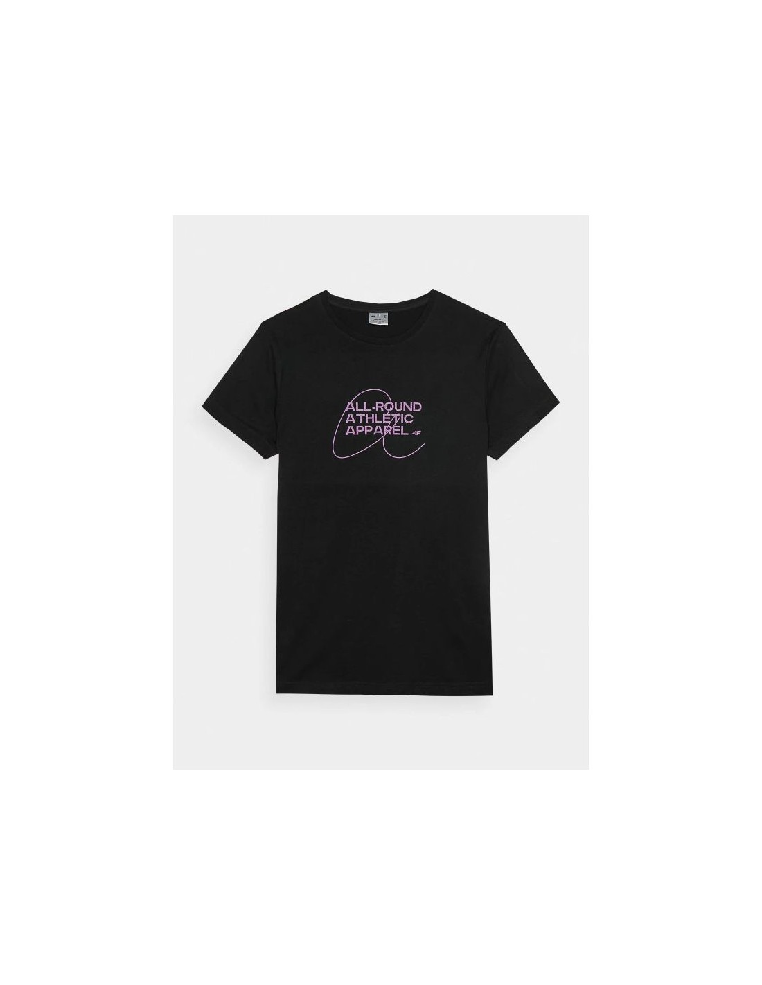 This women's printed T-shirt is perfect for both casual and everyday sporty outfits. It has a slim fit that fits close to the body and a standard hip-length cut. The single jersey weave with a smooth surface on one side makes it flexible and comfortable to wear. The 4F women's T-shirt is made of 100% cotton, making it soft, durable, and pleasant to the touch. The crew neckline is finished with a light ribbed trim. The "All-Round Athletic Apparel" lettering is visible on the front. size range: XS-XL cut: slim, which adapts to the silhouette made of 100% cotton, making it soft, durable and pleasant to the touch uniform colors that will match many styles soft-touch single jersey fabric with a smooth surface round neckline with light ribbing "All-Round Athletic Apparel" lettering on the front