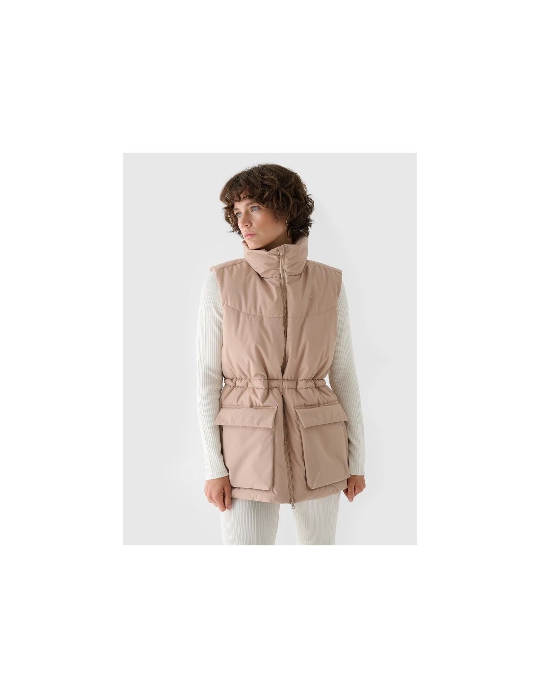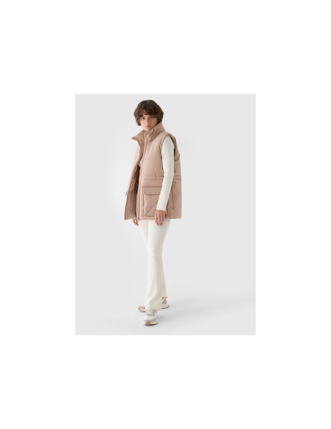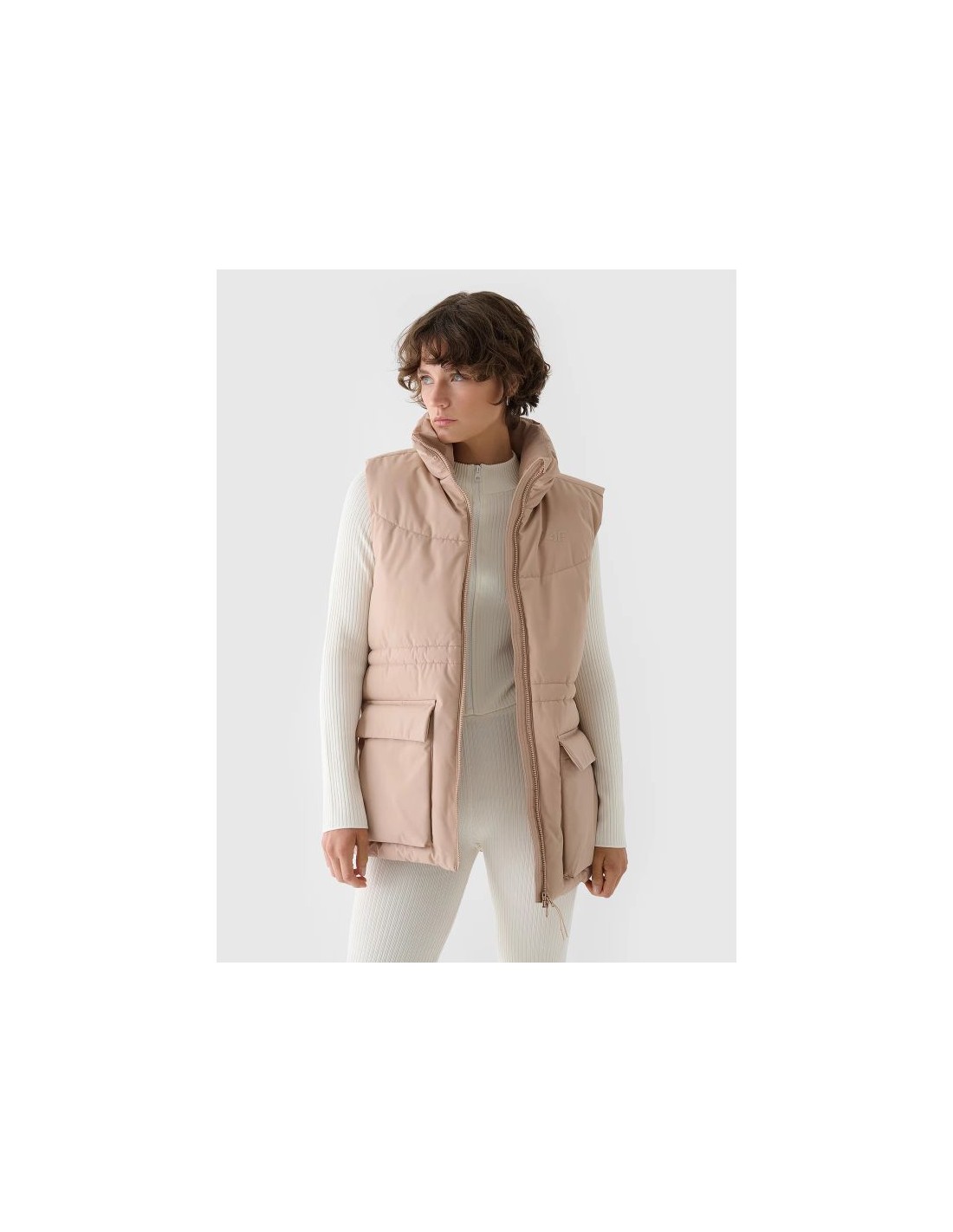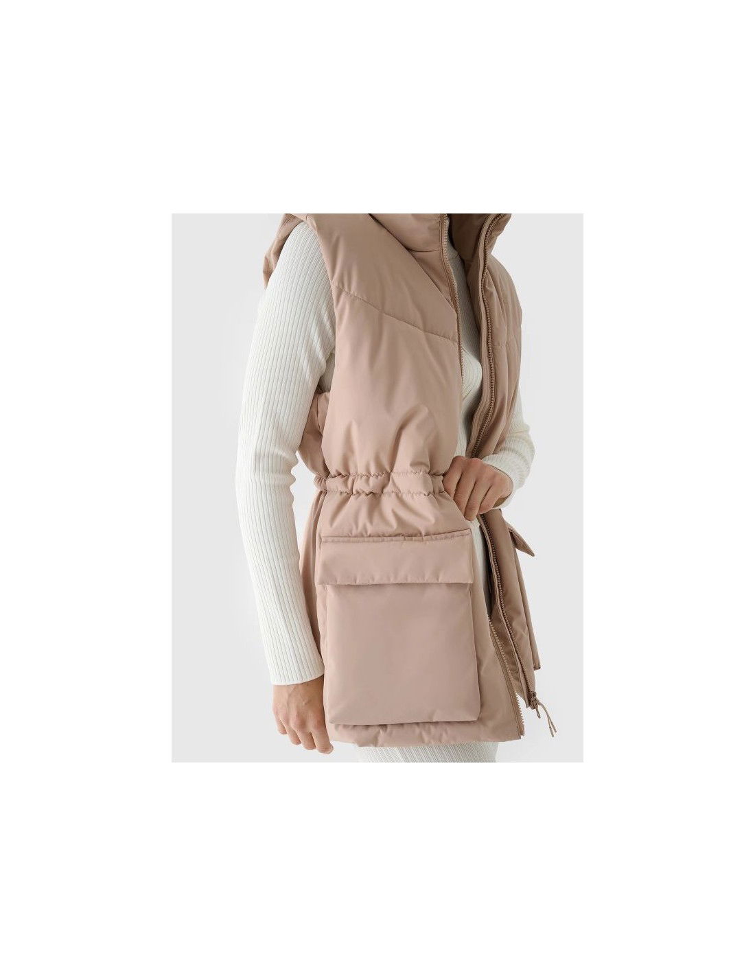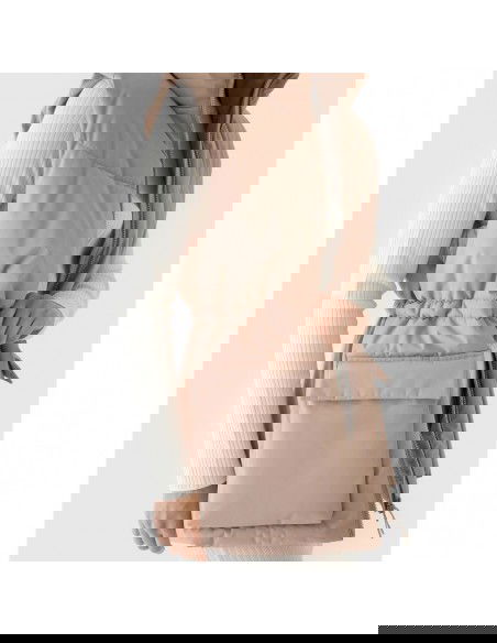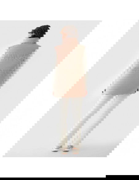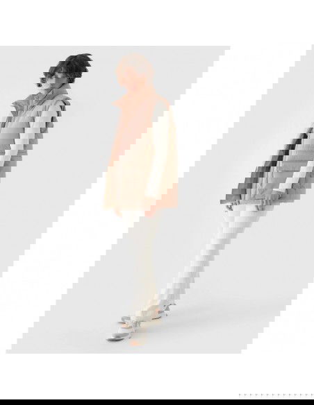 Women's Sleeveless Vest. Synthetic down filling is more durable and easier to care for than natural down. Even when exposed to moisture, it retains its insulating properties for a longer period of time and dries much faster. Furthermore, it doesn't require complicated washing and drying processes. Support in urban spaces: hydrophobic impregnation: A hydrophobic impregnation coating covers the outer layer of the fabric, protecting it from water absorption. The coating causes moisture to bead on the surface of the fabric or knit, then rolls off freely. Practical everyday solutions. A high collar protects the neck, providing additional protection against cold and wind. Two flap pockets are located on the sides. This women's vest fastens with a two-way main zipper with an internal wind flap to prevent cold from entering the jacket. The waist can be adjusted using a tunnel drawstring with toggles. cut: loose, which fits loosely on the body and provides freedom standard cut reaching to the hips polyester, smooth lining the hydrophobic coating of the outer material limits the absorption of moisture high collar 2 open side pockets with flaps two-way main zipper with internal wind flap waist adjustment with a tunnel drawstring with stoppers made of synthetic material that is durable and easy to care for synthetic down filling provides adequate insulating properties even in humid conditions PARAMETERS: Filling: 100% polyester (synthetic down) The product does not have a membrane, but is covered with a hydrophobic impregnation that retains moisture on the surface of the material and slows down its penetration into the interior. The product is intended for colder days during the transitional period. Medium-volume product. Main material: 100% Polyester Lining: 100% Polyester Filling: 100% Polyester