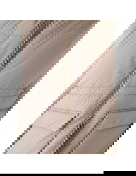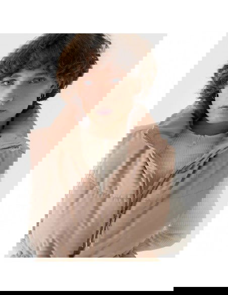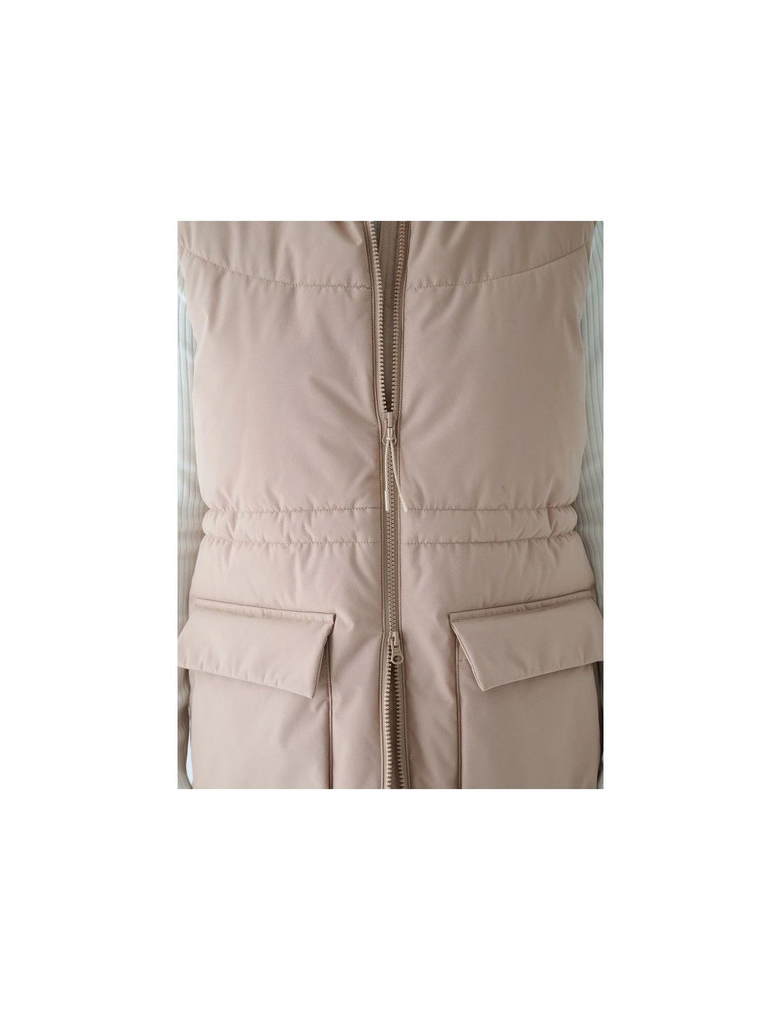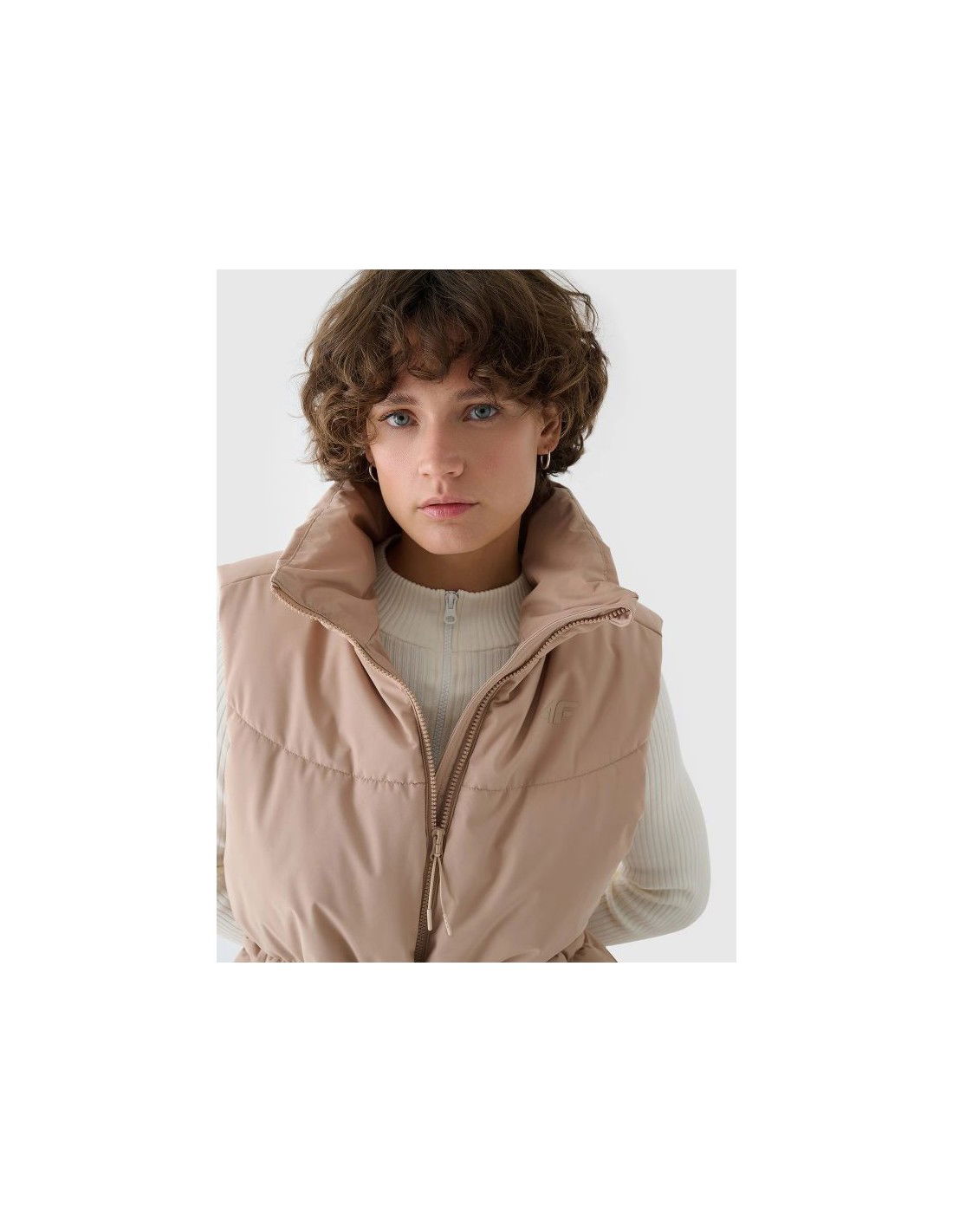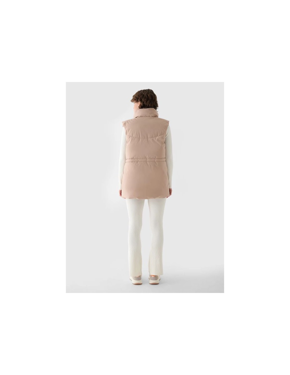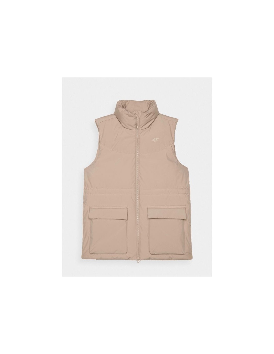 Women's Sleeveless Vest. Synthetic down filling is more durable and easier to care for than natural down. Even when exposed to moisture, it retains its insulating properties for a longer period of time and dries much faster. Furthermore, it doesn't require complicated washing and drying processes. Support in urban spaces: hydrophobic impregnation: A hydrophobic impregnation coating covers the outer layer of the fabric, protecting it from water absorption. The coating causes moisture to bead on the surface of the fabric or knit, then rolls off freely. Practical everyday solutions. A high collar protects the neck, providing additional protection against cold and wind. Two flap pockets are located on the sides. This women's vest fastens with a two-way main zipper with an internal wind flap to prevent cold from entering the jacket. The waist can be adjusted using a tunnel drawstring with toggles. cut: loose, which fits loosely on the body and provides freedom standard cut reaching to the hips polyester, smooth lining the hydrophobic coating of the outer material limits the absorption of moisture high collar 2 open side pockets with flaps two-way main zipper with internal wind flap waist adjustment with a tunnel drawstring with stoppers made of synthetic material that is durable and easy to care for synthetic down filling provides adequate insulating properties even in humid conditions PARAMETERS: Filling: 100% polyester (synthetic down) The product does not have a membrane, but is covered with a hydrophobic impregnation that retains moisture on the surface of the material and slows down its penetration into the interior. The product is intended for colder days during the transitional period. Medium-volume product. Main material: 100% Polyester Lining: 100% Polyester Filling: 100% Polyester