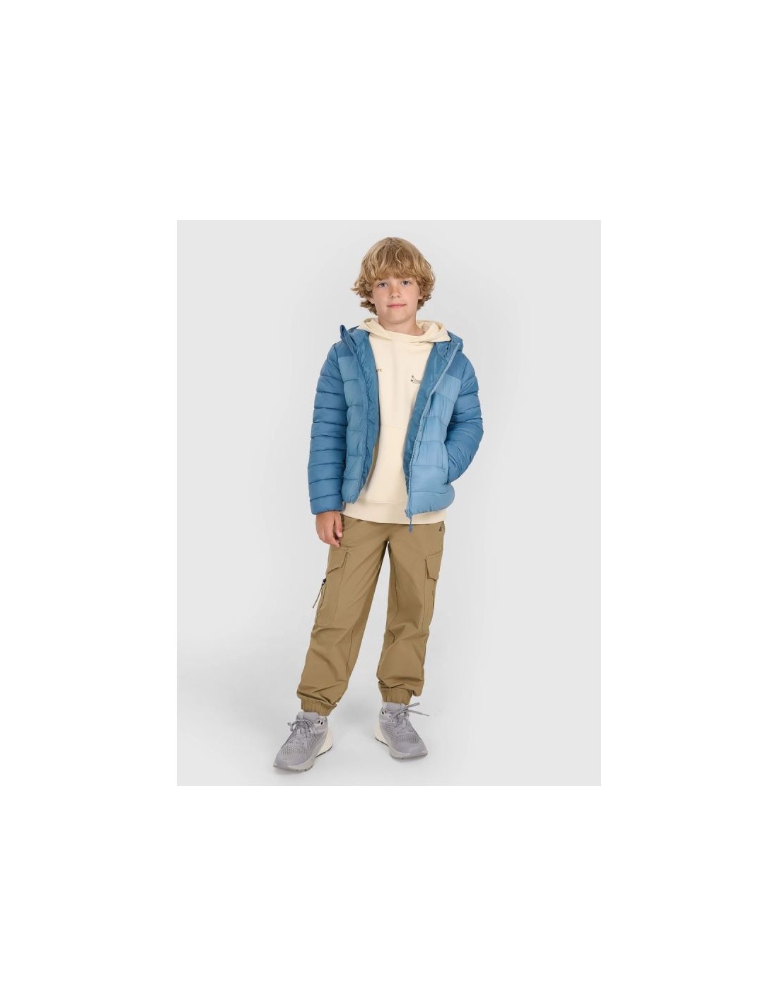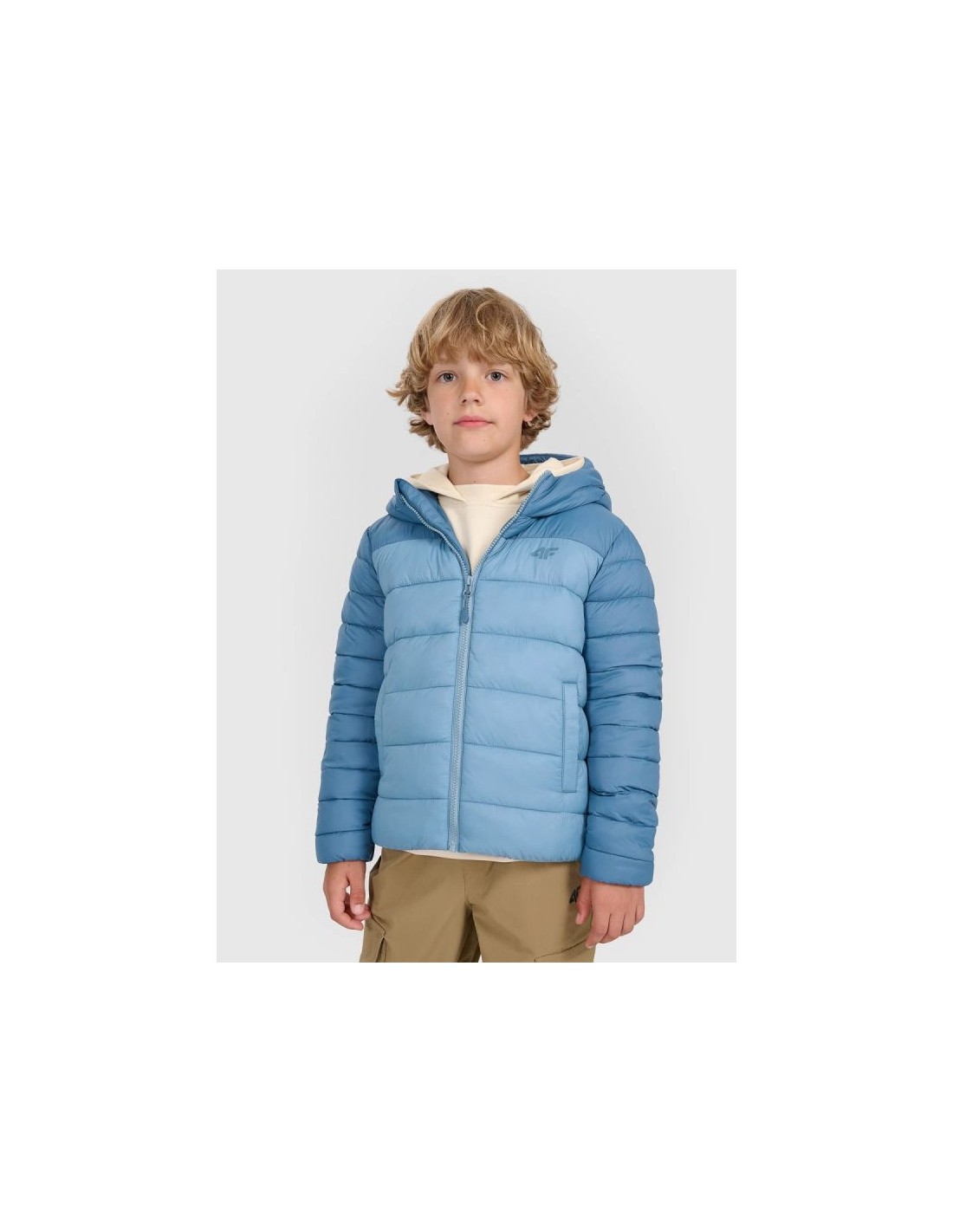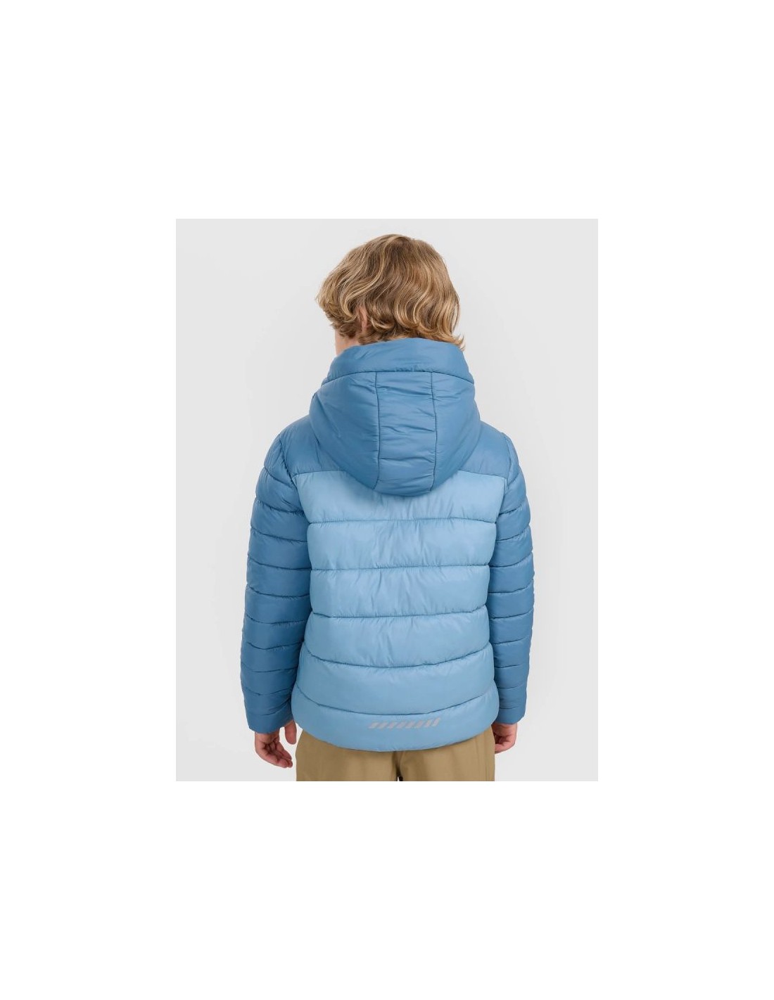 Boys' down jacket with synthetic filling - light insulation for colder days This boys' down jacket was designed for active children who need a comfortable and functional outer layer during the transitional and winter seasons. The synthetic fill provides effective thermal insulation while maintaining freedom of movement. CHARACTERISTICS: Cut – regular, ensures comfortable use and freedom of movement. Intended use – everyday use: school, walks, outdoor activities in colder conditions. Filling – synthetic, effectively insulating, easy to care for. Hydrophobic coating – limits moisture absorption, which helps maintain thermal comfort even in light humidity. Functional details – integrated hood, full zipper, side pockets, elastic cuffs and hem for better warmth retention. Composition – outer material: polyester; filling: synthetic (exact composition depends on the production batch). Weight – standard insulation suitable for conditions colder than early autumn, but not extreme winter. This model works well as a standalone outer layer or paired with a base layer, such as a fleece or thermal one. Its comfortable fit allows for comfortable everyday wear and outdoor activities. Check also: jackets and vests for boys , trousers for boys
