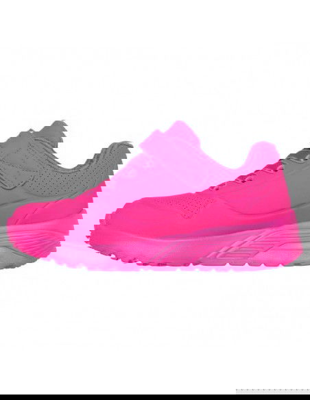 - The smooth upper made of synthetic material in a vibrant pink color (Hot Pink) attracts attention, while elastic laces with a Velcro closure make them easy to put on.