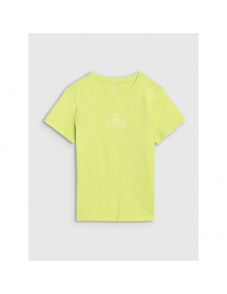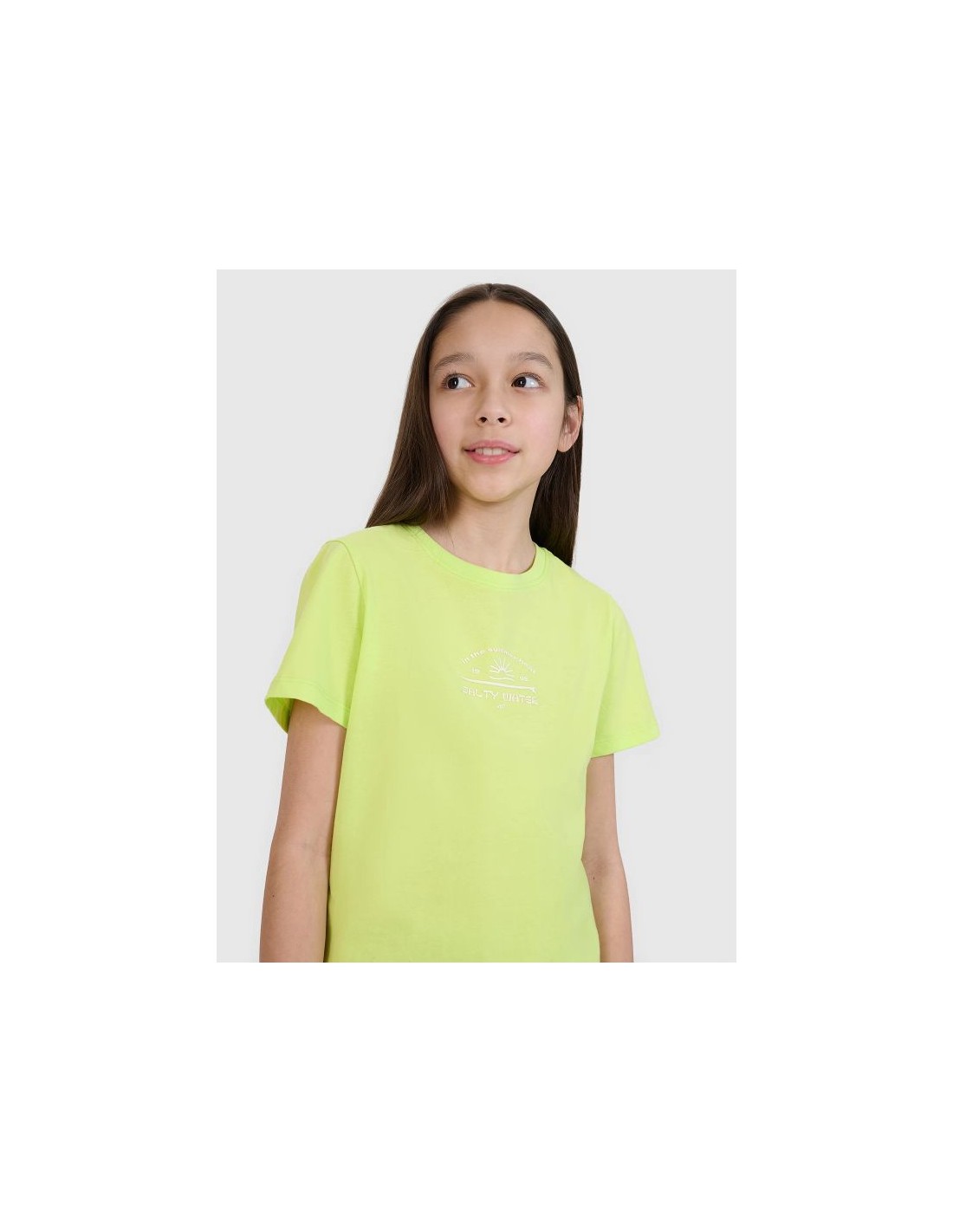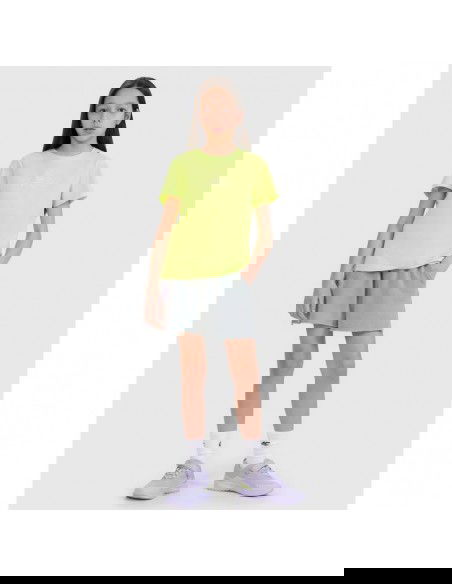 The girl's T-shirt is perfect as an element of both casual and sporty everyday styling . It has a regular fit that comfortably adapts to the body and a standard length that reaches to the hips. The single jersey weave with a smooth surface on one side makes the T-shirt flexible and comfortable to wear. The girls' short-sleeved T-shirt , thanks to its 160 gsm weight , is soft, light and airy - perfect for summer or as an undershirt under a sweatshirt or shirt. This 4F girls' T-shirt is made of 100% cotton , ensuring comfort , durability , and a pleasant feel . The crew neckline is finished with a light rib, and the surfer print adds energy and summer style. T-shirt for girls – FEATURES: Weight 160 gsm – light and durable material , ensuring comfort of wearing Size range 122–164 – fits a variety of body shapes Regular fit – comfortable fit, without being too tight 100% cotton – soft , durable and pleasant to the touch fabric Uniform colors – universal design , suitable for many styles Single jersey fabric – smooth and soft structure Round neckline with light ribbed detailing – a flexible and comfortable finish Surfer print – a dynamic accent inspired by beach style