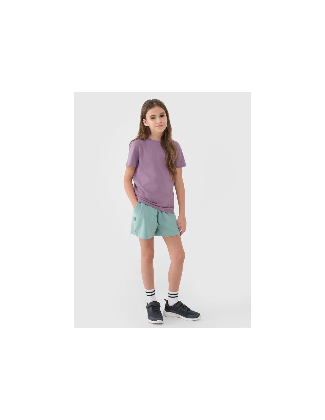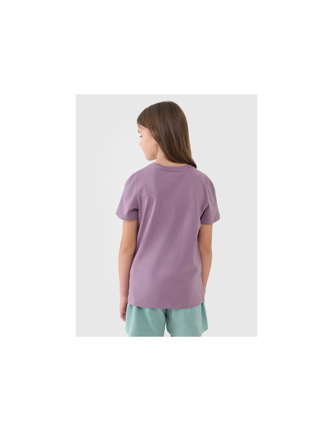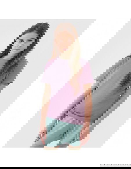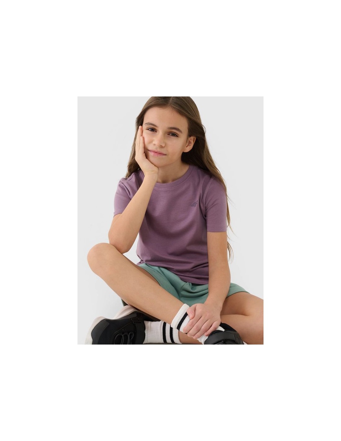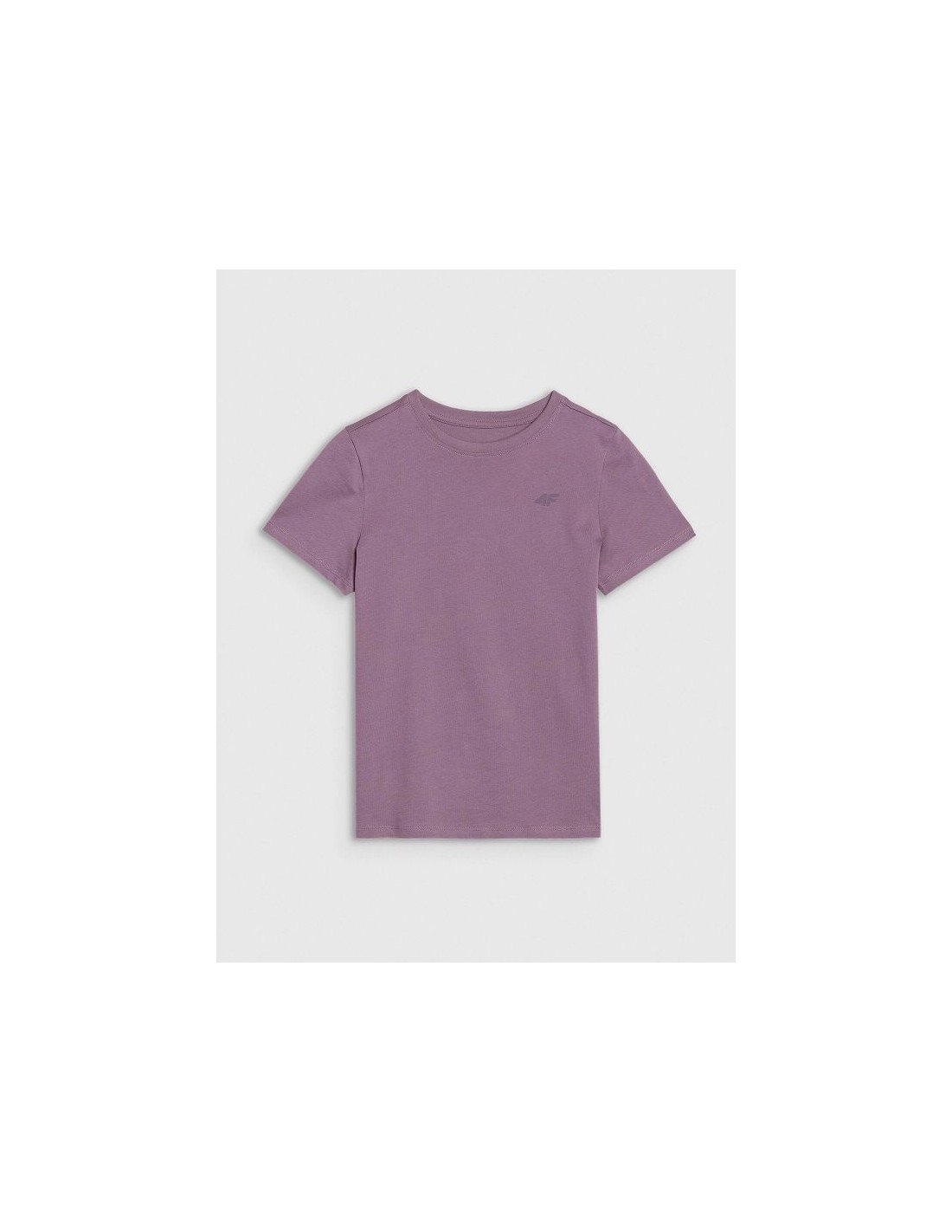 4F Regular Girls' T-Shirt - Everyday Comfort in Purple This girls' regular, plain T-shirt is a perfect wardrobe staple for active girls. It works well with both everyday and sporty outfits, offering comfort and functionality – especially on warmer days. Key product features Regular fit – classic design, comfortably fitted to the body Weight 150 gsm - light and airy single jersey fabric , perfect for summer or as an undershirt 100% cotton – a natural material that is soft , durable and pleasant to the touch Smooth single jersey weave – flexible, uniform surface, ensuring comfort of wearing Round neckline with light ribbed detailing – delicately finished neckline, resistant to deformation Uniform, intense purple color – a universal color, easy to style This 4F girls' T-shirt combines lightness , natural material and versatility , making it a staple for summer styling and outdoor activities.