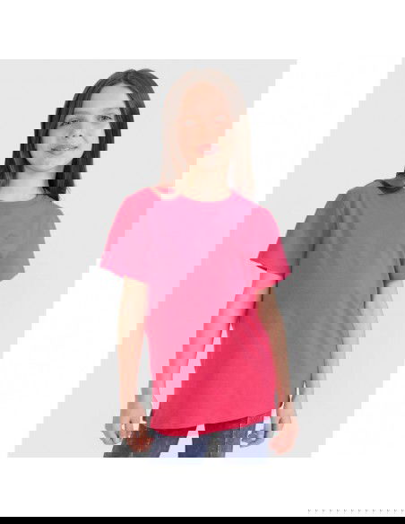 4F Regular Girls' T-Shirt - Everyday Comfort in Purple This girls' regular, plain T-shirt is a perfect wardrobe staple for active girls. It works well with both everyday and sporty outfits, offering comfort and functionality – especially on warmer days. Key product features Regular fit – classic design, comfortably fitted to the body Weight 150 gsm - light and airy single jersey fabric , perfect for summer or as an undershirt 100% cotton – a natural material that is soft , durable and pleasant to the touch Smooth single jersey weave – flexible, uniform surface, ensuring comfort of wearing Round neckline with light ribbed detailing – delicately finished neckline, resistant to deformation Uniform, intense purple color – a universal color, easy to style This 4F girls' T-shirt combines lightness , natural material and versatility , making it a staple for summer styling and outdoor activities.