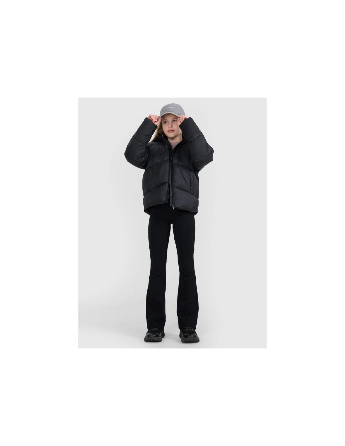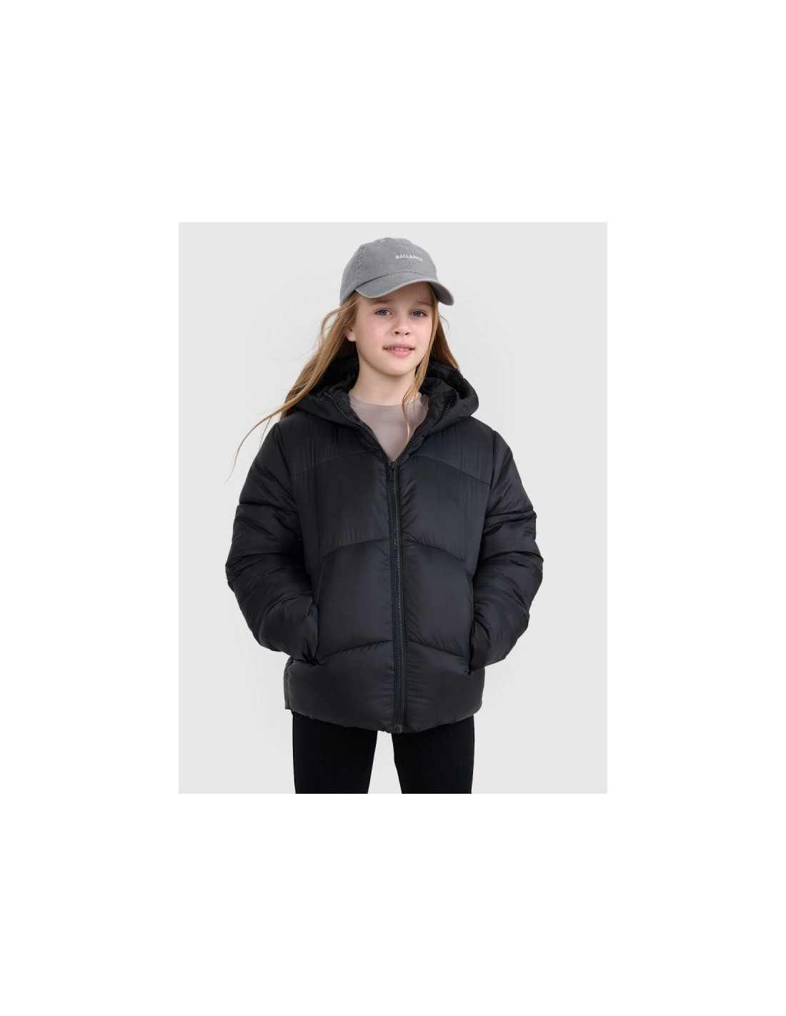 Girls' down jacket with synthetic filling - light and warm for cold days This girls' down jacket is designed to provide thermal comfort during everyday activities on cooler days. The synthetic fill provides warmth without weighing you down, while the lightweight construction allows for freedom of movement, perfect for school, walks, and outdoor play. CHARACTERISTICS: Cut – regular, ensures comfort and natural freedom of movement. Intended use – everyday use on colder days, for school, walks and outdoor activities. Filling – synthetic “down” insulation that effectively retains heat and is easy to care for. Membrane – a model without a membrane, designed for thermal insulation. Hydrophobic coating – slows down the absorption of moisture, providing additional protection against light rain. Functional details – hood, full zip with chin guard, side zip pockets, ribbed cuffs and bottom hem. Composition – outer material: polyester; filling: synthetic, easy to clean and quick-drying. Weight – standard for mid-season jackets with medium insulation. This jacket is perfect as a top layer during transitional periods or mild winters. Paired with a sweatshirt or fleece, it will provide increased warmth. Its versatile color and simple cut make it easy to pair with jeans, leggings, or outdoor pants. Check also: girls' jackets and vests , pants for girls