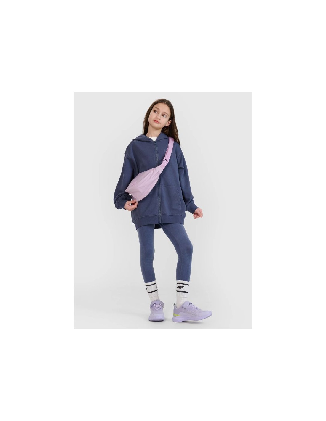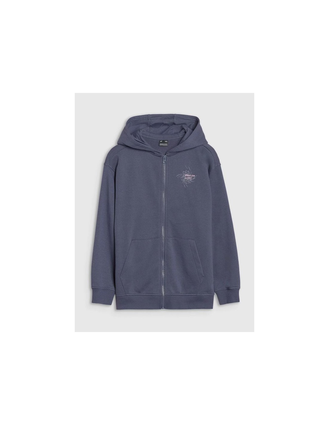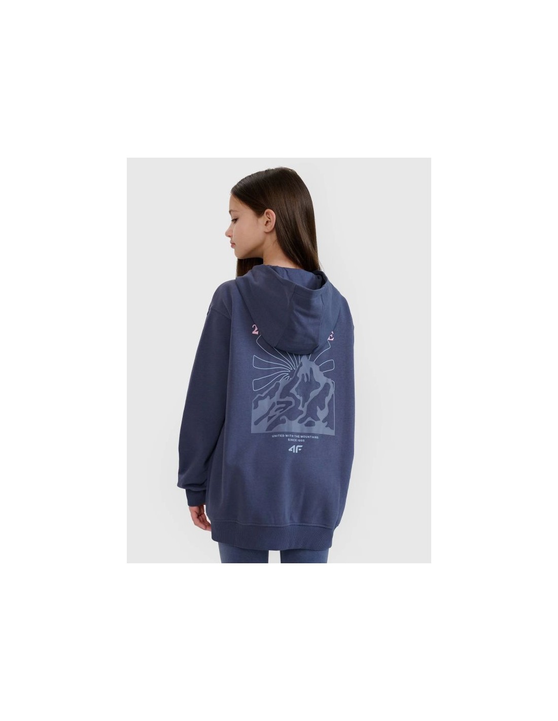 Girls' sweatshirt with a hood 4F - comfort and style for everyday wear The 4F girls' zip-up hooded sweatshirt is a practical everyday choice, perfect for both casual and sporty outfits . Thanks to its regular cut , the sweatshirt comfortably fits a child's figure, ensuring freedom of movement and comfort. Made of French terry sweatshirt fabric , which is smooth on the outside and looped on the inside, it guarantees adequate breathability and softness . The 300 gsm weight ensures durability without sacrificing lightness and flexibility . The most important features of a sweatshirt for girls : Weight : 300 gsm – perfect for the transitional season Sizes : 122–164 – fits various body shapes Material : 80% cotton – softness , durability , pleasant to wear Addition of polyester (20%) – ensures resistance to wear and maintains shape French terry knit fabric – smooth on the outside, looped on the inside Regular fit – classic fit and comfort Integrated hood – additional protection on colder days One-way zipper – easy and quick to put on Elastic cuffs and hem with drawstring for a better fit 2 open side pockets – space for small items Decorative prints – a delicate print on the chest and a fashionable coordinate print on the back No lining – greater lightness and airiness Why is it worth choosing a 4F hoodie for girls ? Functional and fashionable – perfect for school, walks and physical activity High-quality materials – for use for many seasons Classic design with modern details – fits many styles Suitable for the transitional season and summer evenings