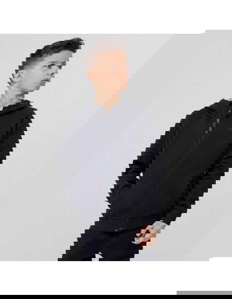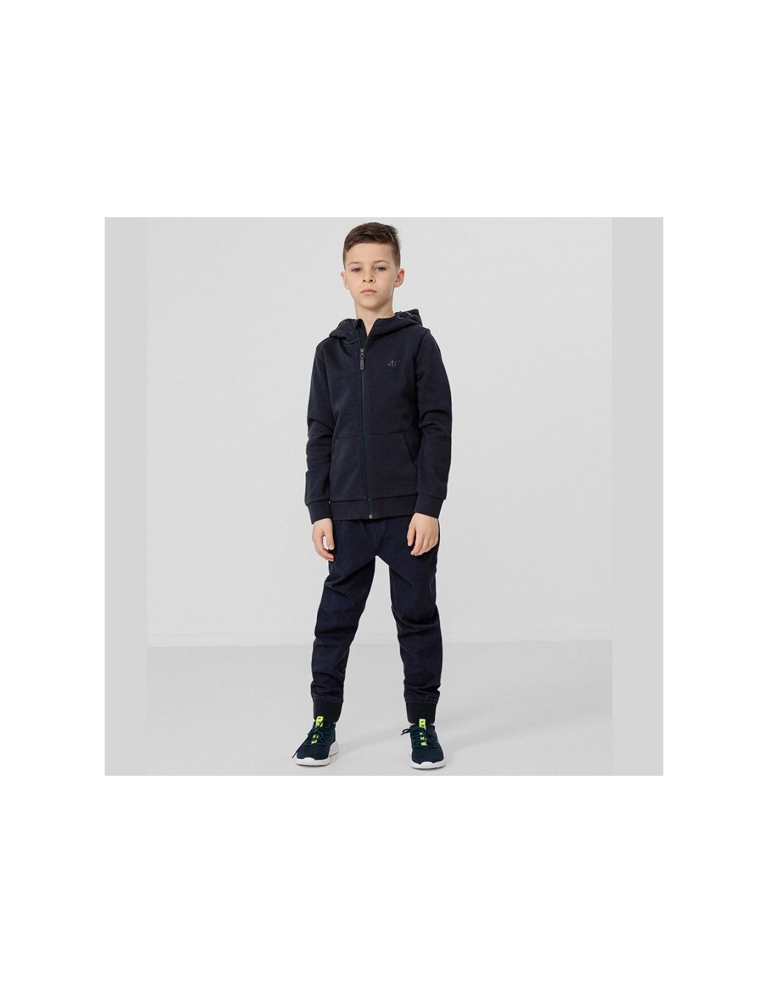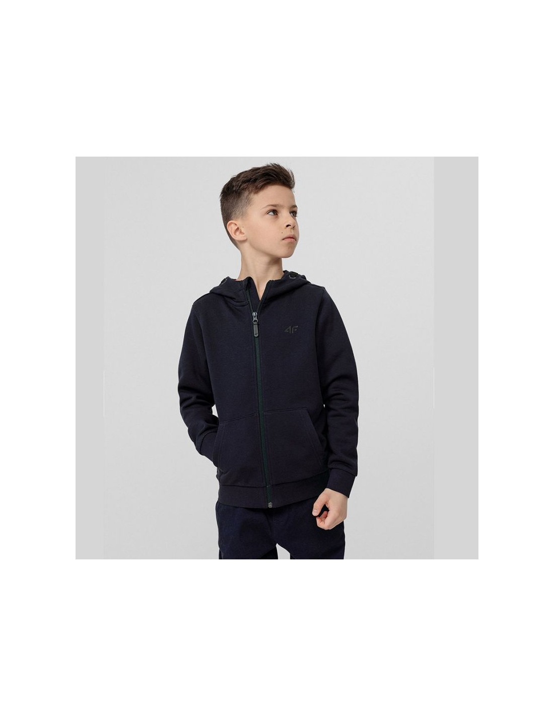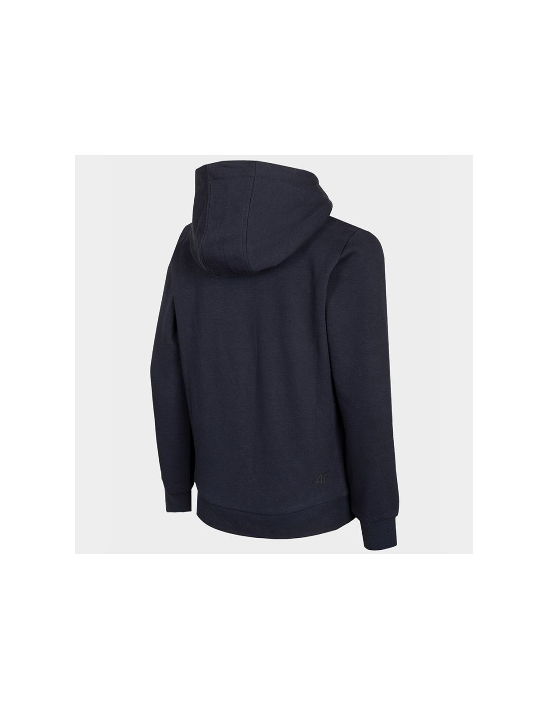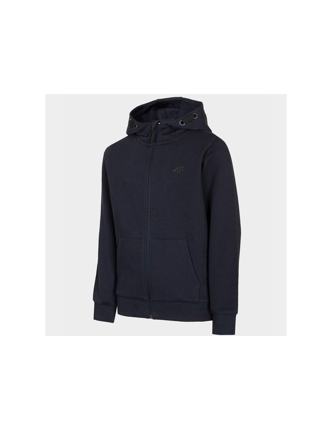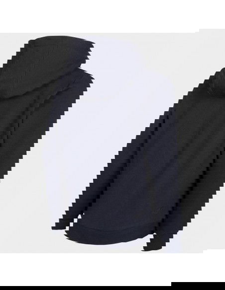 Properties: Junior 4F hoodie. Soft construction combining breathable cotton and durable polyester. The full-length zipper makes it easy to put on and take off. Two side pockets for small items. Integrated hood with drawstring adjustment. Ribbed cuffs and hem. Material: cotton, polyester Color: navy