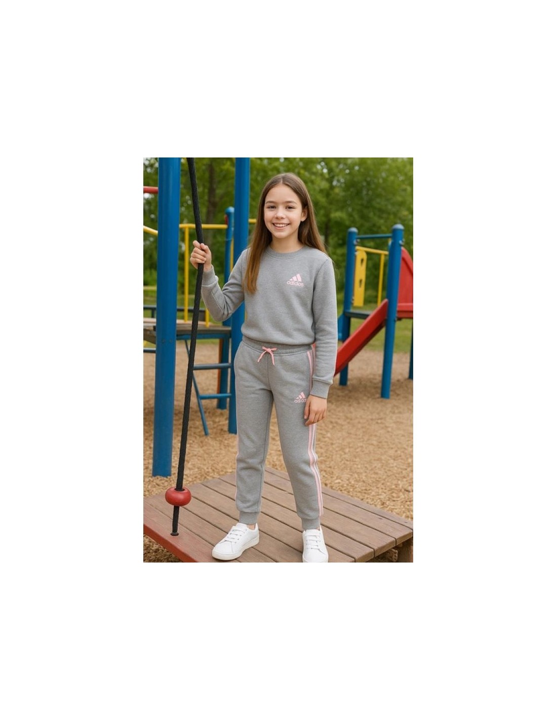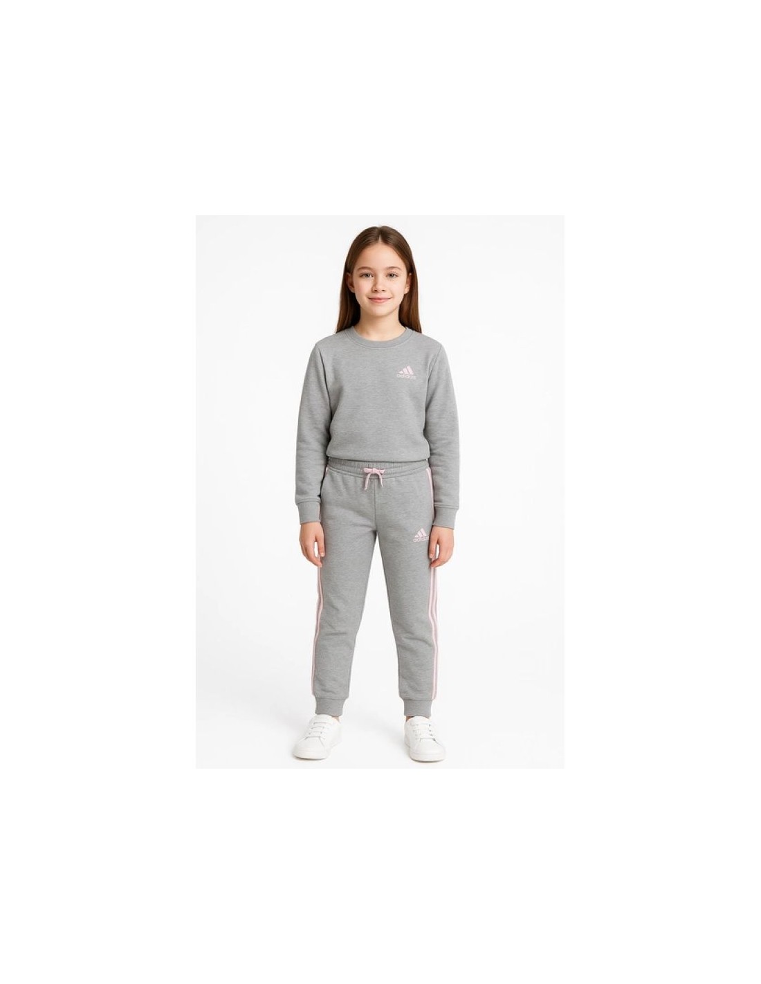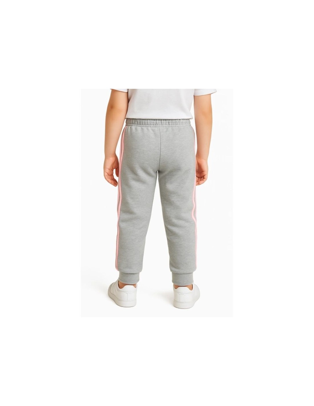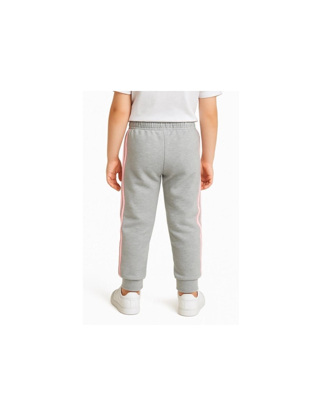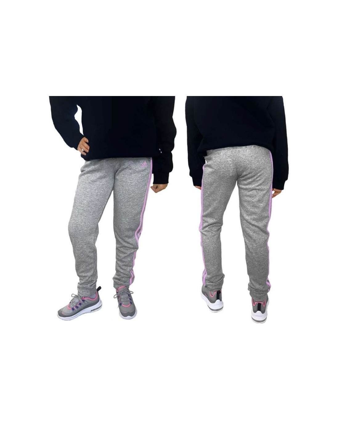- Fashionable Adidas sweatpants in gray with pink stripes and a logo.