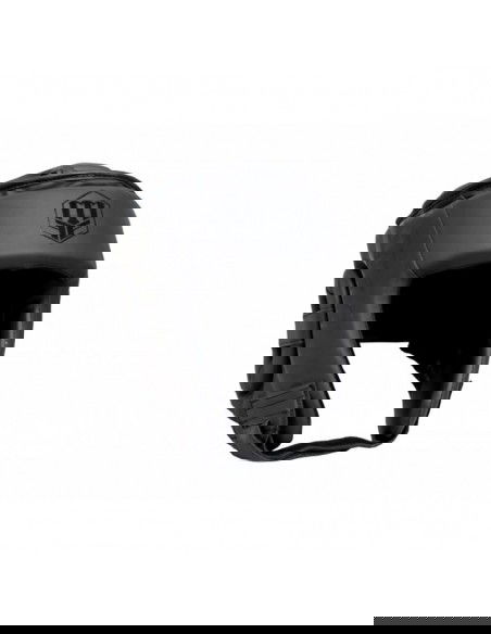 Tournament helmet KTOP-PU-MATT with a built-up top of the head, designed for training and competition. Crafted from synthetic black leather in a matte finish with an eye-catching glossy print.