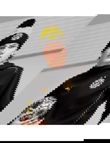 The Puma Borussia Dortmund Pom Pom Beanie is recommended for any Borussia Dortmund fan looking to stay warm and show their team pride during the colder months.