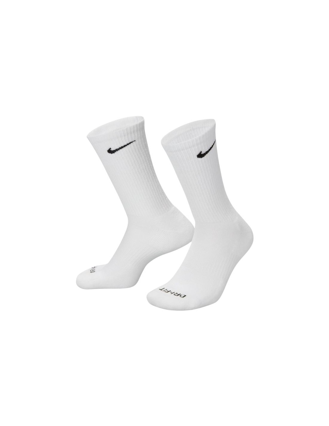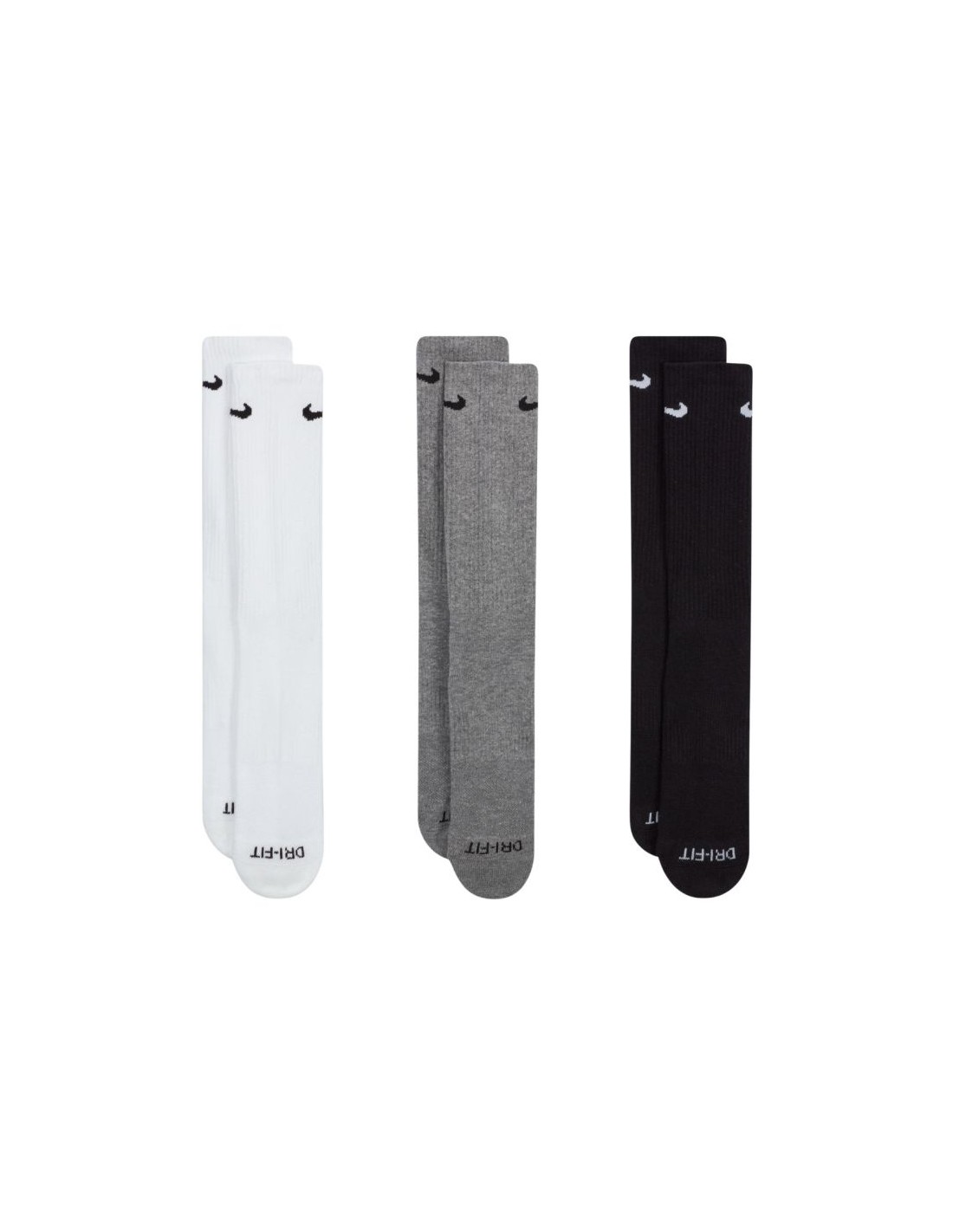 Nike Everyday Plus Cushioned Socks 3 Pairs White, Gray, Black SX6888 964. These 1/3-calf Nike socks help you stay comfortable during physical activity. Their ergonomic design and durable, flexible materials ensure breathability and moisture management. Dri-FIT technology ensures breathability and moisture management. A special band fits snugly around the arch of your foot for support. Cushioning in the forefoot and heel area. Ribbed uppers prevent the socks from riding up. The upper panels are made of finer yarns for improved ventilation. Reinforced heel and toe areas increase durability. Set includes 3 pairs. Material: 62-69% cotton, 29-36% polyester, 2% spandex