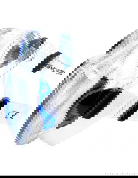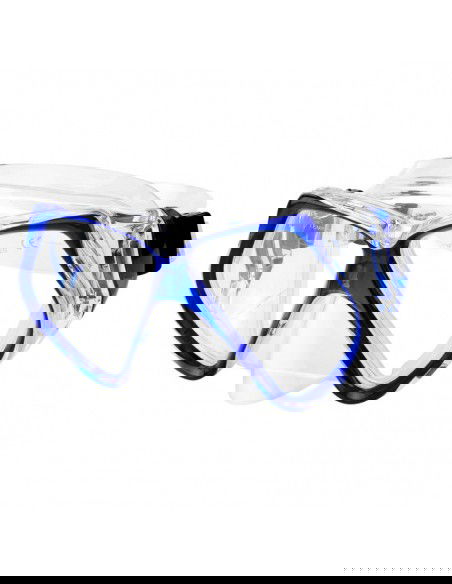 - Its shape and the collar with a strap made of liquid silicone, which is very easy to suck in, adapts perfectly to the face. Two teardrop-shaped windows made of tempered TG glass increase the perspective and width of vision underwater horizontally and vertically.
