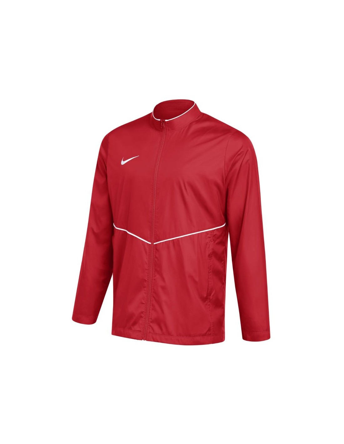 Nike Park 26 Rain Jacket Red HM7265 657 This Nike men's jacket is perfect for training. Dri-FIT technology wicks away moisture. The fabric provides protection from light rain. Standard fit. Full-length zipper. Stand-up collar. Zippered side pockets. Piping. Small logo. Material: 100% recycled polyester