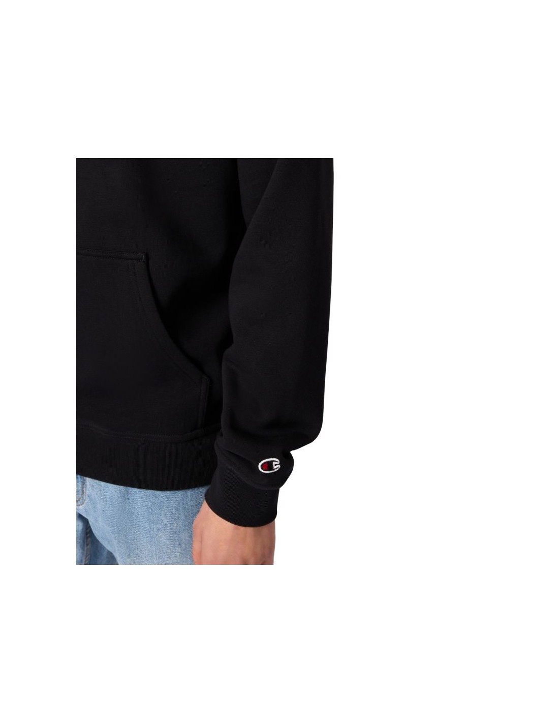 Champion Men's Hooded Sweatshirt, Black 220271 KK001. This Champion men's sweatshirt is perfect for everyday wear. Standard fit. Fixed, adjustable hood. Ribbed cuffs and hem. Front pocket. Logo on chest and sleeve. Material: 70% cotton, 30% polyester.