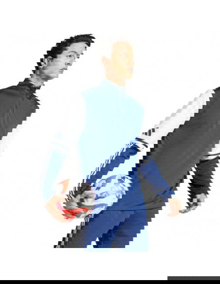 - The zipper reaches halfway down the chest and is finished with a chin guard. Stand-up collar. Small logo. Stripes on part of the sleeves.