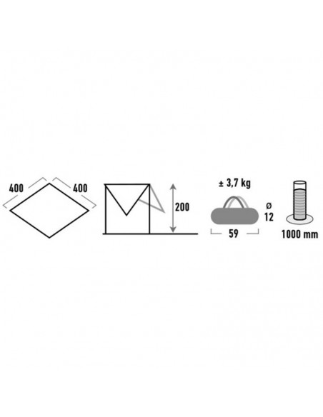 - Tarpaulin dimensions: 400x400 cm · height of posts: 200 cm · dimensions after folding: 59 cm x o 12 cm · 8 reinforced eyelets ·