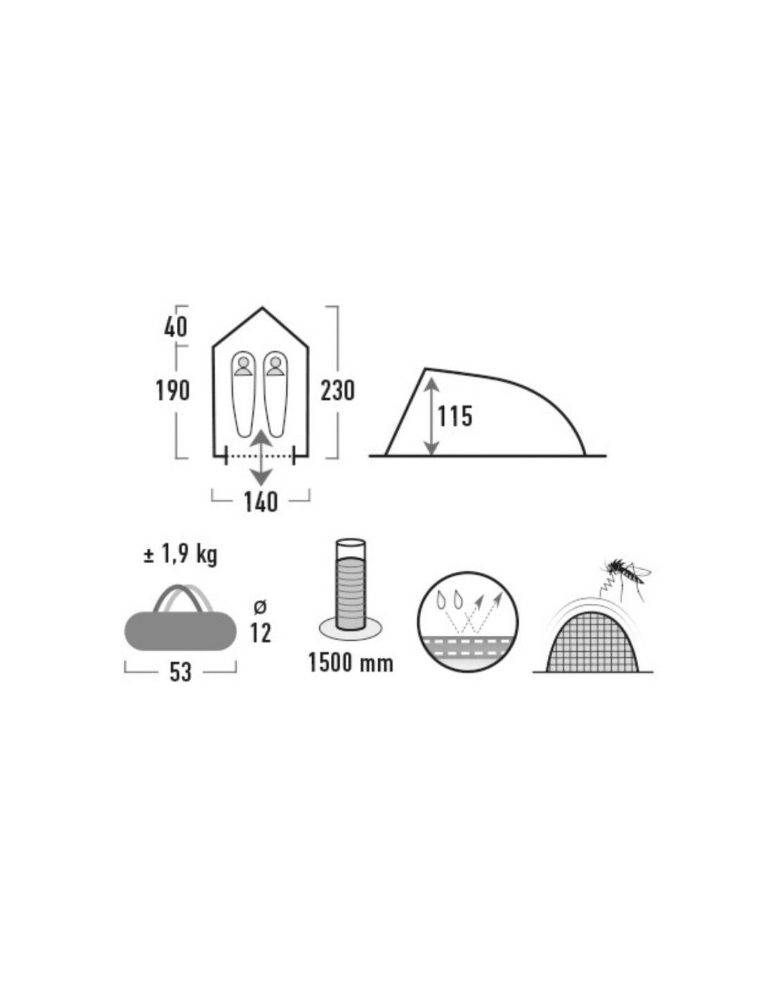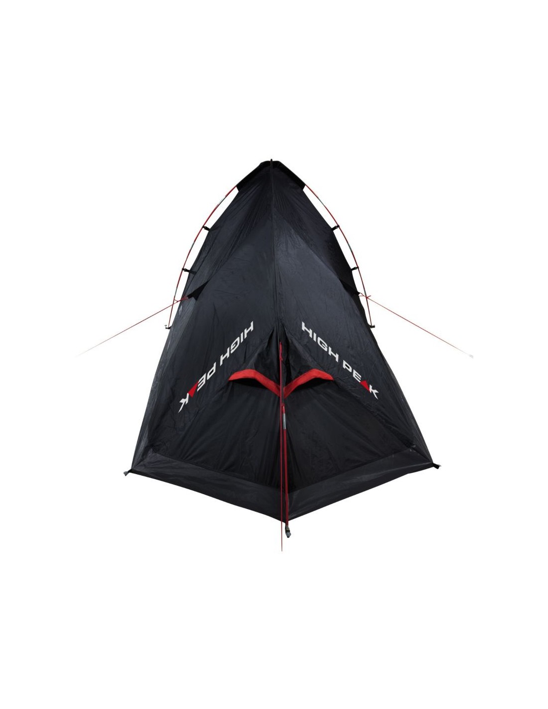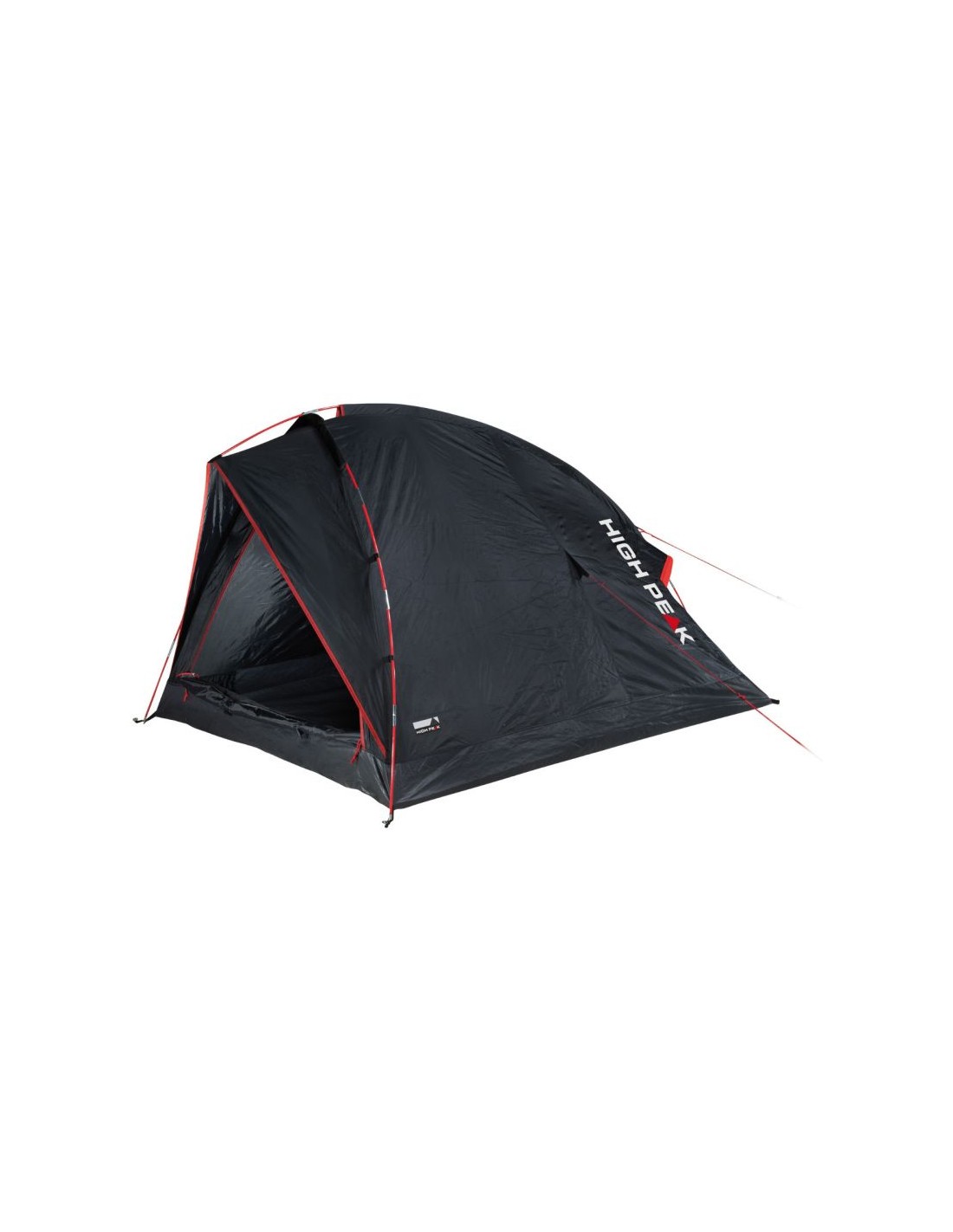 High Peak Minitramp 2 Tent Black 10151 Properties: The High Peak single-skin 2-person tent will be indispensable for various trips. Two-post construction. The high arched entrance without a central pillar has an additional mesh that supports the interior ventilation process. The high-quality material has been given a hydrophobic, environmentally friendly DWR impregnation without PFC. Waterproof, taped seams. Mosquito net. The interior of the tent will allow two people to sleep. Technical data: Number of people: 2 Water resistance: 1500 mm water column Flysheet: 100% PU polyester, taped seams Frame: fiberglass, diameter 7.9 mm Dimensions: 230 cm x 140 cm (including 40 cm vestibule) Height: 115 cm Dimensions when folded: 53 cm x 12 cm Weight: 1.9 kg · Arched entrance · Double entrance with full mesh door Lamp holder · Pocket inside 3 fixed air vents · Zippered carry bag, PFC-free
