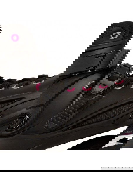 - Boot: It is made of a rigid skeleton that provides easy maneuverability thanks to the short runner. The skeleton of the skate is well ventilated thanks to the ventilated insert with holes around the entire perimeter, including the tongue. The roller joint is equipped with a special screw and nut, which allows the cuff to be replaced and tightened, which increases the life of the skate compared to articulated rivets.