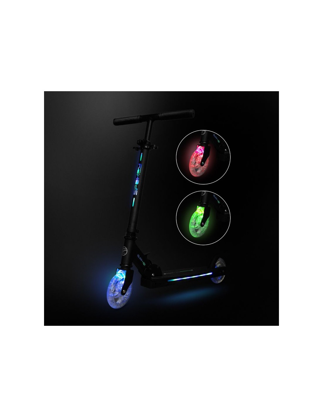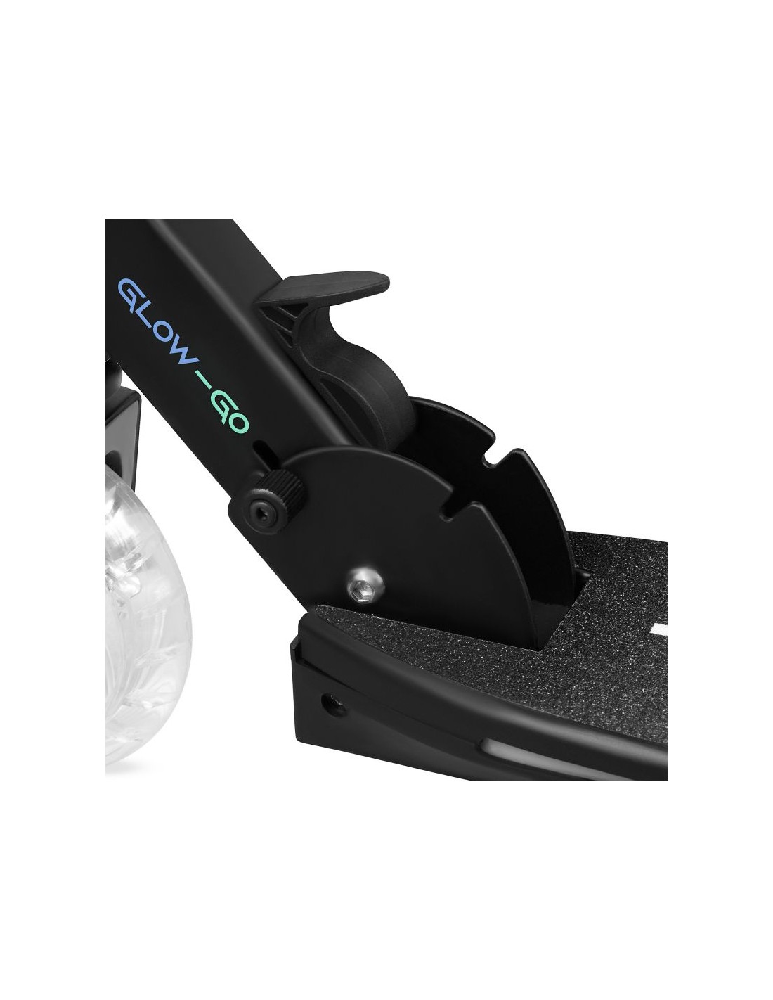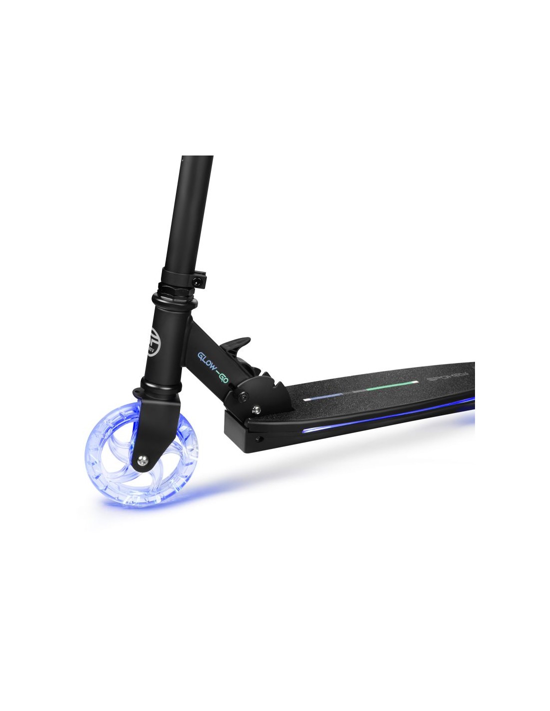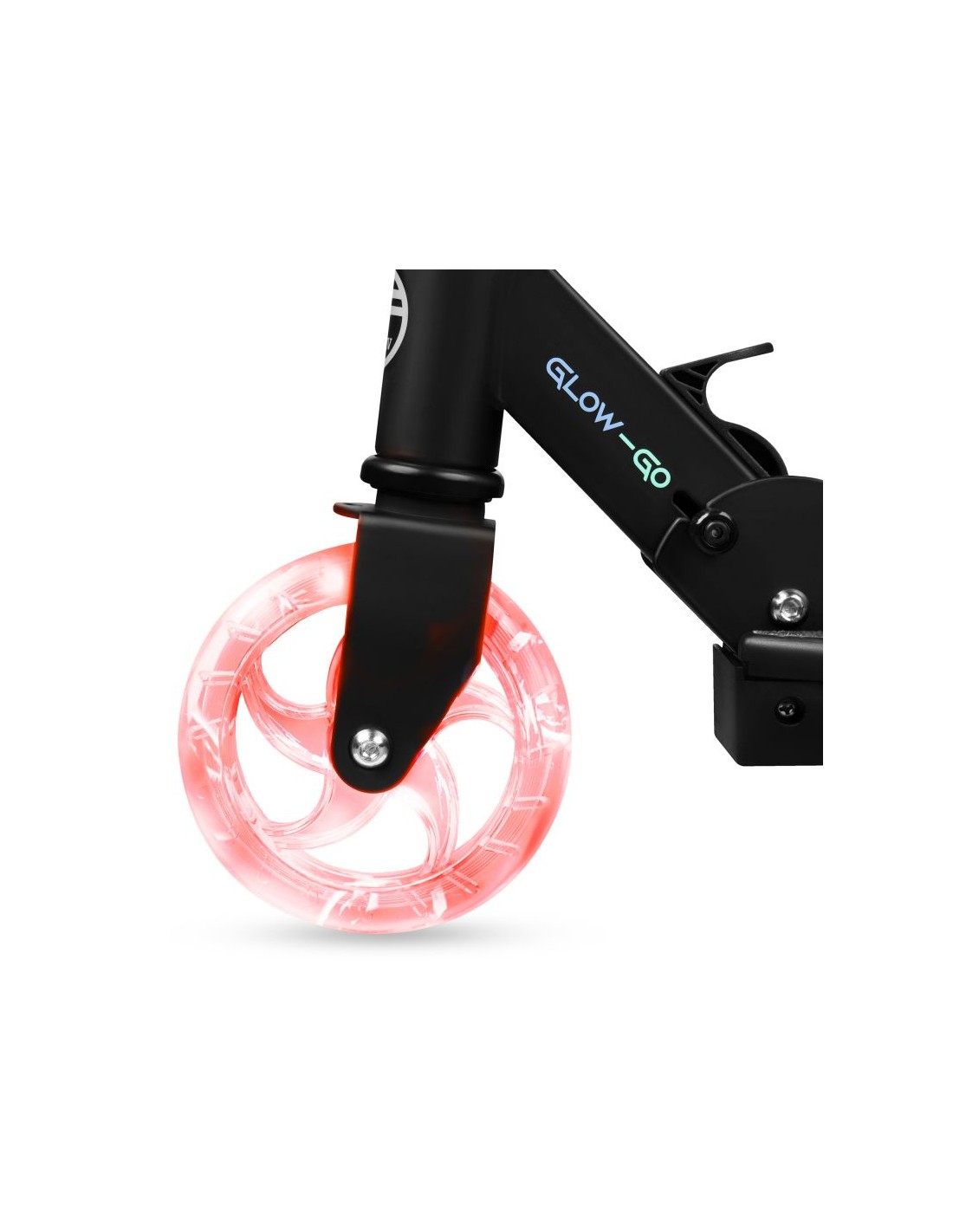 Properties: A lightweight, foldable youth scooter with eye-catching LED lighting The Glow Go scooter is the perfect choice for children and teenagers, combining functionality with aesthetics. Thanks to the built-in LED lighting and illuminated wheels, it not only provides great fun and a spectacular effect, but also visibility on the road. Its low weight and foldability make it extremely convenient to transport and store. Key features: LED backlight: color changing for an eye-catching ride. Transparent, illuminated wheels: 120 mm diameter for smooth movement and better visibility after dark. Anti-slip deck: stability while riding. Adjustable handlebar height: three levels (66-71-76 cm) adapted to the user's height. Foot brake: easy and safe stopping. Compact: easy folding and lightweight design (2.95 kg). The Glow Go scooter is a perfect option for young users looking for unique equipment for recreational riding. The Glow Go stands out from other models in its class thanks to its LED backlight with the ability to change the light color while riding, and transparent, glowing wheels that illuminate the route after dark. The design of the scooter is light and at the same time durable. The non-slip deck ensures stability, and the adjustable handlebar allows for adjustments to the individual needs of a child or teenager, allowing the Glow Go to grow with its owner. Thanks to its low weight and foldable design, the scooter is easy to carry and store, making it an ideal solution for both everyday fun and trips. Why choose the Glow Go scooter? Eye-catching design: LED lighting and illuminated wheels attract attention and add to the driving fun. Lightness and mobility: compact dimensions and low weight make it easy to transport and store. Safety and comfort: the non-slip deck and rubber handles increase stability and comfort while riding, and LED lights increase the user's visibility after dark. Height adjustment: adjustable handlebar allows use by children and teenagers of different heights. Ease of use: simple folding system and foot brake for greater convenience. Technical data: Material: plastic, steel Wheels: PC, 120 mm, transparent, illuminated Scooter dimensions: 76 x 66 x 33 cm Dimensions when folded: 66 x 12 x 24 cm Adjustable handlebar height: 66-71-76 cm Footbrake Weight: 2.95 kg Maximum user weight: 50 kg Standard: EN-71 Recommended for: recreational riding Skill level: beginner, intermediate Safety notes: Personal protective equipment must be worn. Not suitable for children weighing more than 100 kg. To be used under adult supervision. Do not use in traffic. Instructions for use