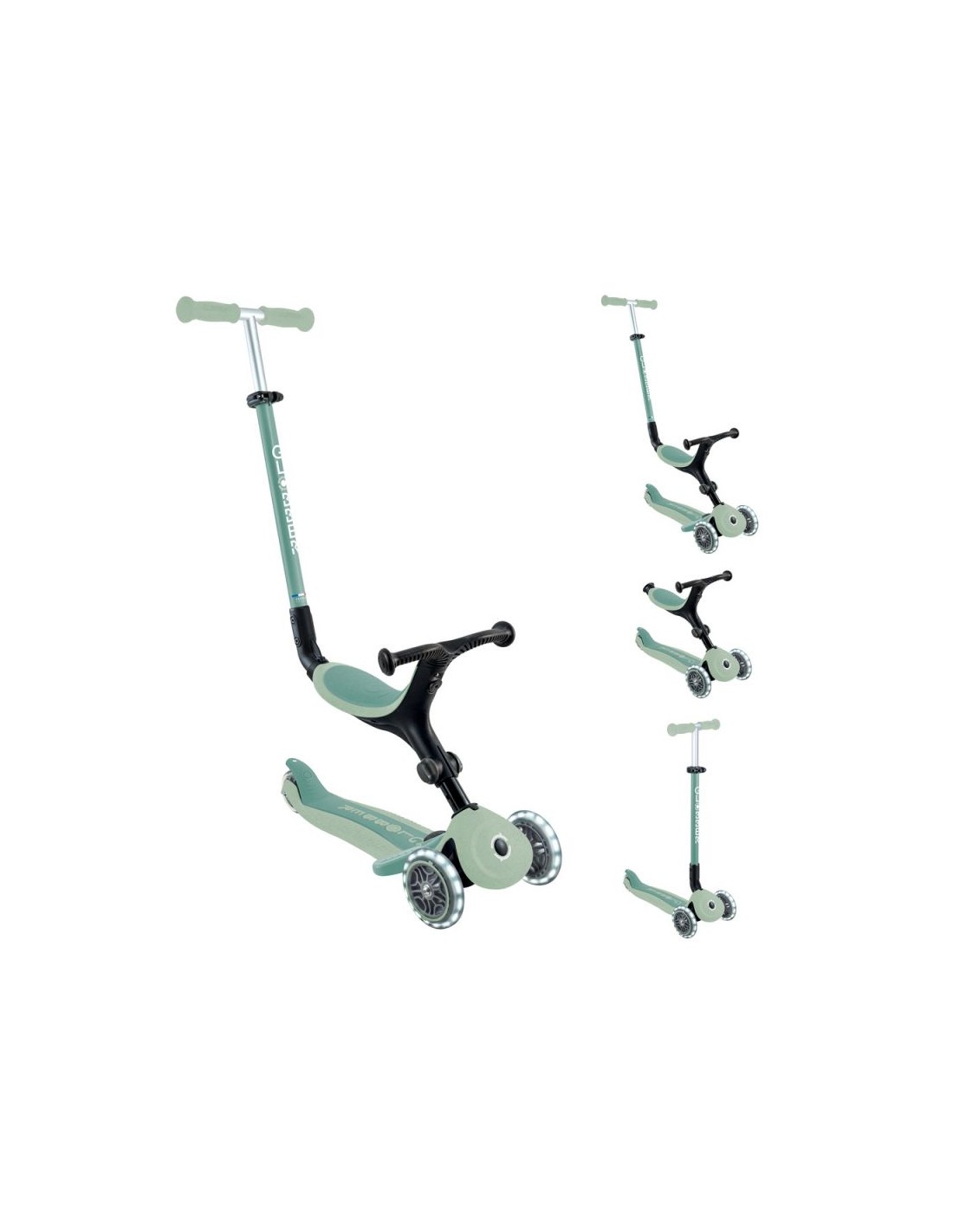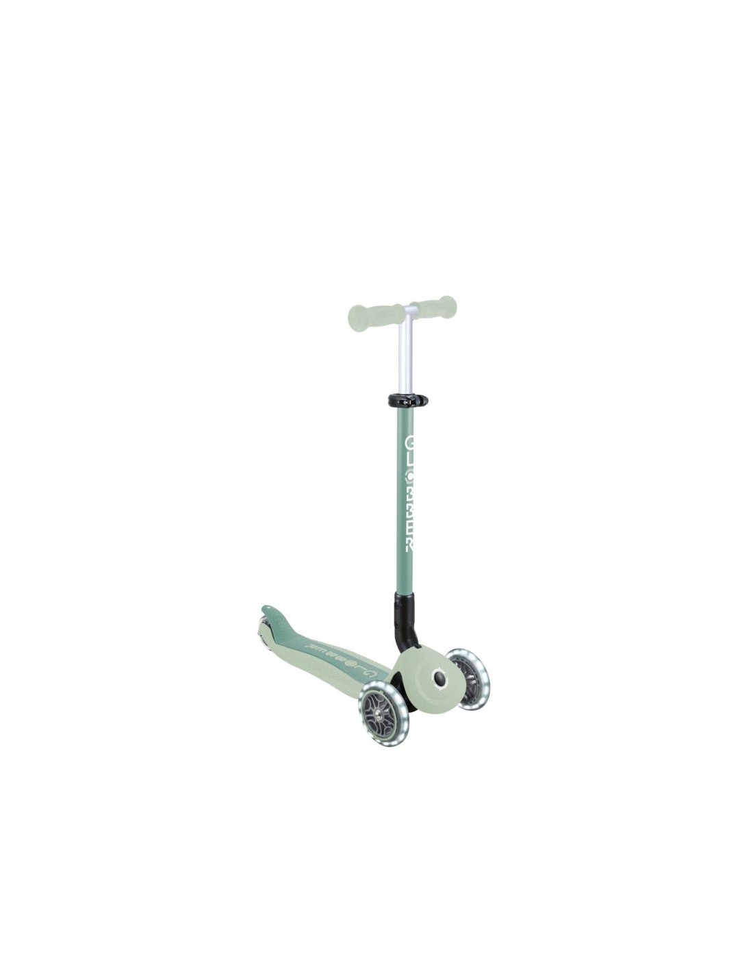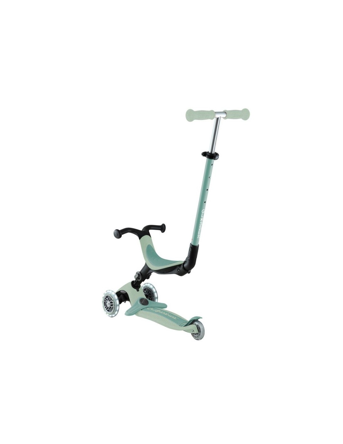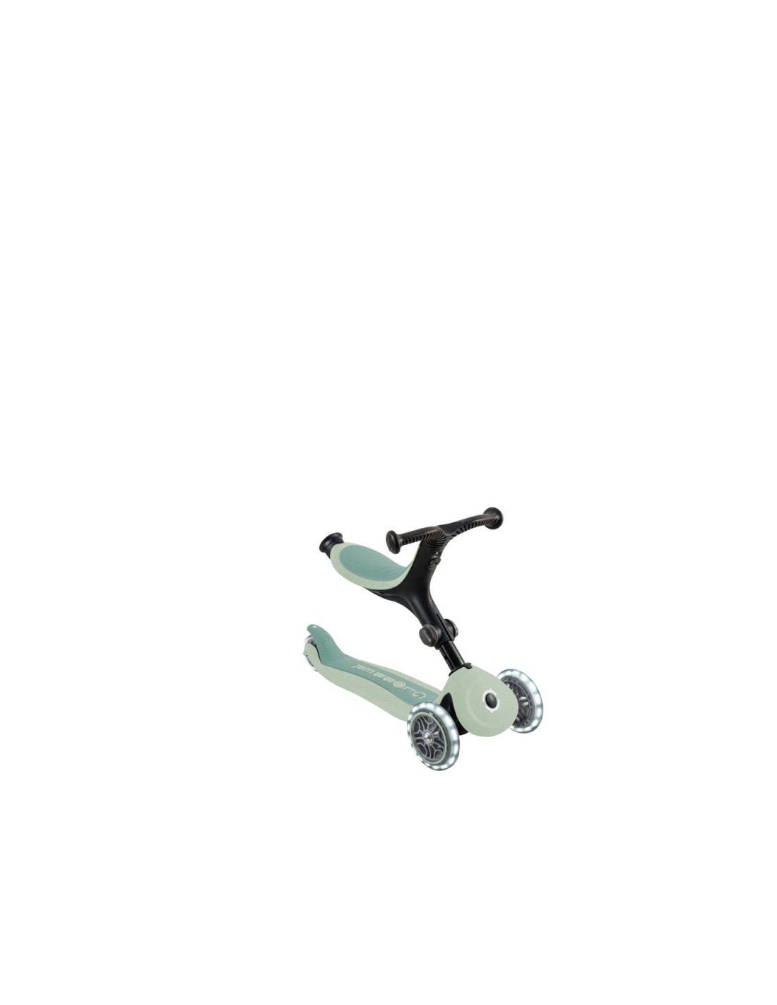 GO • UP Active Lights ECOLOGIC An eco-friendly all-in-one scooter with a seat for small children, made from 100% recycled plastic and organic wheat straw*, and equipped with light-up wheels. The vehicle offers 3 modes: ride-on car with handle for parents (15 months - 3 years) tricycle - balance bike (15 months - 3 years) scooter with 4-level height adjustment and foldable structure (3-9+ years) Simple, tool-free and intuitive transformation between modes using a solidly designed combination of buttons and knobs. The patented folding system allows for convenient transport and storage of the vehicle. The patented steering lock system allows for straight-line driving only. This option is useful for beginners; once your child has mastered balance, you can restore full control with a single button. The vehicle is equipped with light-up wheels that flash white while driving and do not require the use of any batteries. Made from 100% recycled plastic to the global GRS standard and biodegradable wheat straw* Eco-friendly packaging made from recycled paper and is plastic-free. GO • UP Active Lights ECOLOGIC is available in four pastel colors inspired by nature: pistachio, peach, blueberry and bilberry. GO • UP Active Lights ECOLOGIC is made of 100% GRS plastic and biodegradable wheat straw*. GRS is an international protocol that verifies the recycled content of end products. Using GRS plastic saves tons of waste from landfills and mitigates the environmental impact of production. Wheat straw is a 100% renewable, biodegradable bioplastic derived from agricultural waste. Using wheat straw diverts waste and helps decompose other plastics. The plastic maintains its structural integrity and is 100% child-safe. Choose Globber. Choose greener! 100% tool-free design 100% tool-free design allows you to easily switch between different modes without the need for tools or screws - GO • UP Active Lights ECOLOGIC has spring-loaded buttons and knobs that allow for a smooth transition from ride-on to scooter mode. Adjustable seat and handlebar for maximum comfort The eco-friendly GO • UP Active Lights ECOLOGIC scooter with a seat has adjustment functions for maximum comfort: TPR saddle with 2-stage height adjustment, adjustable using a side knob without tools 4-step steering wheel adjustment, so the vehicle "grows" with the child. Powerful brake The extra long and wide composite rear brake ensures effective braking. Additional footrest The removable footrest provides additional comfort and safety when riding in ride-on mode. It allows the feet to rest securely while the parent controls the vehicle. Solid platform and durable wheels with LED diodes GO • UP Active Lights ECOLOGIC is equipped with a low, metal-reinforced structure that can withstand up to 50 kg and a wide, non-slip composite deck for a safe scooter ride. High-quality, high-rebound, 121mm diameter PU-molded front wheels mounted on ABEC 5 bearings and an 80mm diameter PU-molded rear wheel provide a smooth ride. The front wheels are equipped with LED lights that flash white while riding. Batteries are not required for the wheels. Patented steering lock system The GO • UP Active Lights ECOLOGIC features Globber's patented steering lock system, which locks the front wheels of the scooter to only move forward and backward, so kids gain confidence while riding their scooter while developing their balance skills. To enter full steering mode and enable balance steering, simply release the handlebar lock button located at the front of the scooter. Patented folding system Effortlessly carry and store your GO • UP Active Lights ECOLOGIC in a compact form! Featuring a patented folding system, easily fold this 3-wheel scooter into stroller mode to carry it around or roll it after a day of scootering fun. LIBRA DIMENSIONS (height / length / width) SEAT HEIGHT stroller 3.86 kg 77.5- 95.5 x 60.02 - 67 x 28 cm 25.5 - 29 cm bike - ride-on 3.23 kg 37 - 41 x 57.5 x 26.5 cm scooter 2.72 kg 67.5 - 82.5 x 57.5 x 28 cm This eco-friendly all-in-one scooter with a seat converts into a ride-on bike, a walker, and a toddler scooter. The ride-on and walker modes are designed for toddlers aged 15-36 months, while the scooter mode is suitable for children aged 3-9+. Made from 100% GRS plastic and biodegradable wheat straw* as a sustainable choice for families. 100% tool-free design allows you to easily switch between different modes without the need for tools or screws - the GO • UP Active Lights ECOLOGIC has spring-loaded buttons and knobs that seamlessly transition from ride-on to scooter mode. The patented folding system allows for convenient folding and offers a stroller mode. Thanks to the easy-to-use side button, you can easily carry and store the GO•UP Active Lights ECOLOGIC in a small space. Globber's patented steering lock system prevents the front wheels from turning, helping children learn and master balance. Adjustable Scooter with Seat: 2-position TPR seat height adjustment (25.5cm or 29cm from the ground), adjusted by a tool-free knob on the side and 4-position T-bar height adjustment (67.5cm, 72.5cm, 77.5cm, 82.5cm from the ground) for a comfortable ride. The low-profile, metal-reinforced structure supports up to 50 kg and features a wide, non-slip composite deck for a safe ride. A long, wide, removable footrest provides added comfort and safety when using the scooter. High-quality, high-rebound 121mm PU cast front wheels mounted on ABEC 5 bearings and a single 80mm PU cast rear wheel provide a smooth ride. An extra-long and wide composite rear brake ensures effective braking and extends wheel life. (* in all applicable elements)