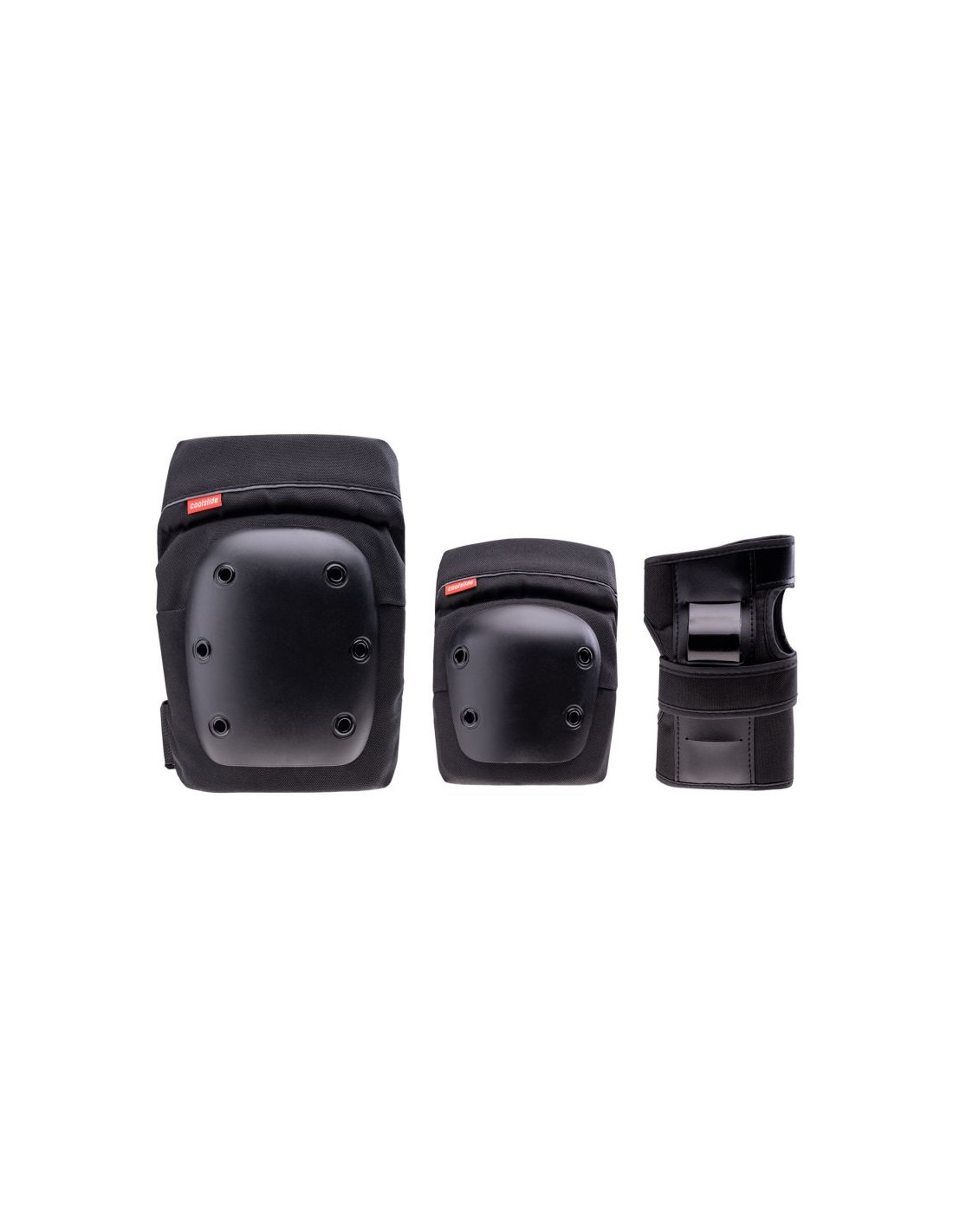 Properties: set of protectors for knees, elbows and wrists black Composition: 20% POLYESTER + 40% FOAM + 35% PLASTIC + 5% METAL