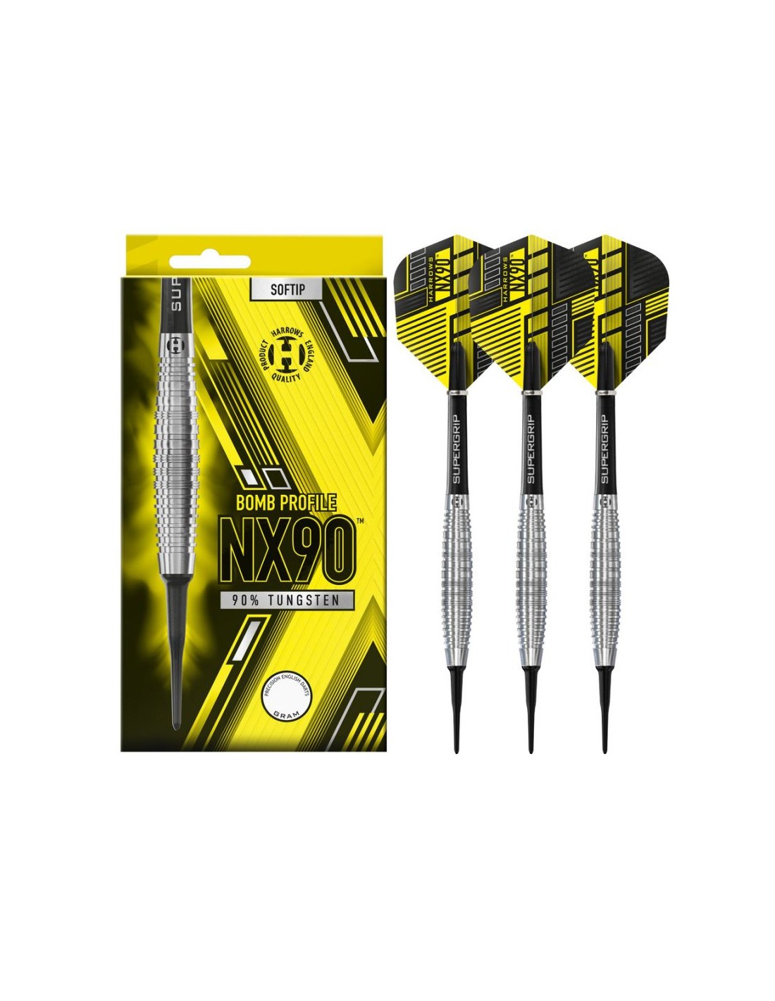 Properties: The NX90 is one of the most successful darts we've released in recent years. Now available in a new profile. The popular ring, micro and wave cuts, first used on the original dart, offer all players a grip sequence tailored to their game. High quality 90% tungsten Three distinctive grip styles NX90 darts feature black, medium-sized Supergrip shafts, new 100-micron NX90 flights and are weighed to an accuracy of +/- 0.05g.