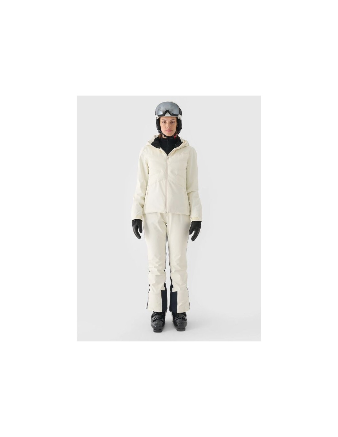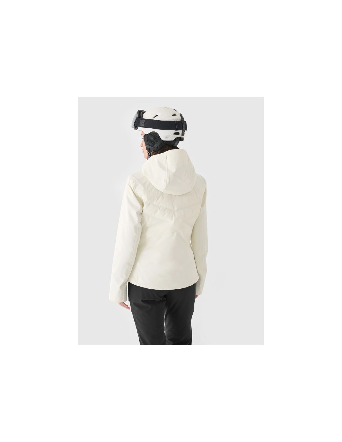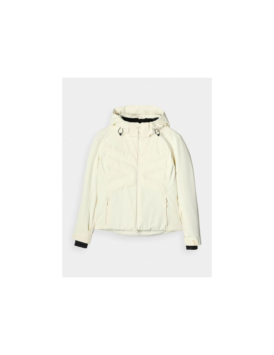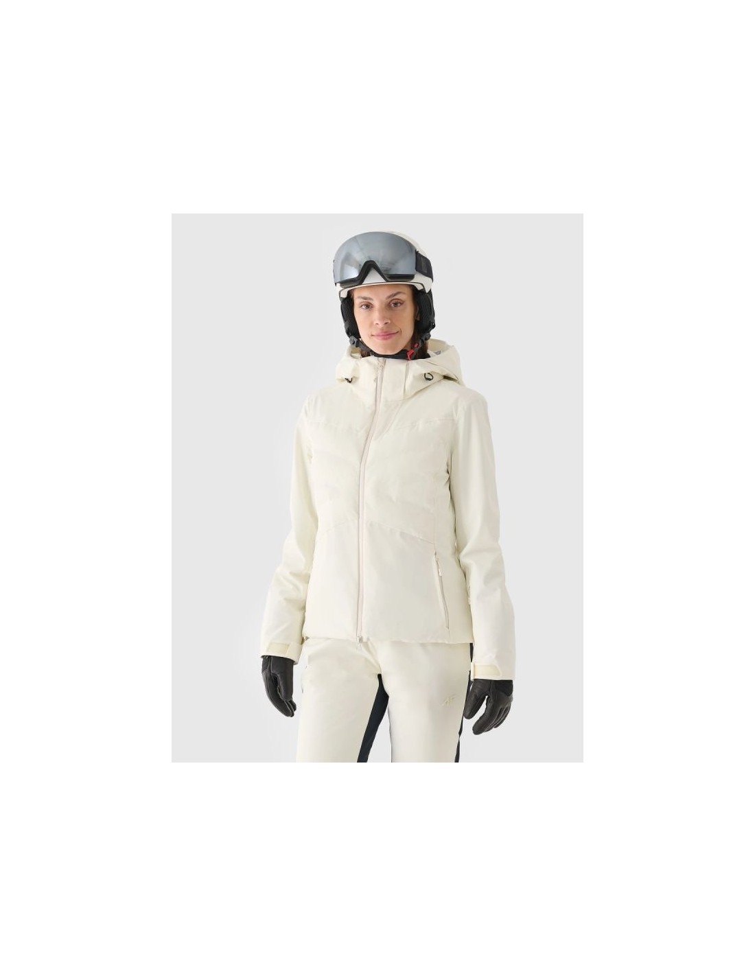 Women's 4F ski jacket with hood - Dermizax 20000, PrimaLoft The 4F women's ski jacket is a technologically advanced model designed for intense winter activities on the slopes. The regular cut and standard hip length ensure a comfortable fit and complete freedom of movement. The combination of a Dermizax 20,000 membrane , PrimaLoft insulation , and flexible 4Way Stretch material guarantees effective protection against wind, snow, and moisture, maintaining thermal comfort for long hours of skiing. This premium jacket is designed for women who expect maximum functionality and reliability in challenging weather conditions. PRODUCT FEATURES: Cut: regular, comfortably fitting to the figure Size range: XS–XXL Material: elastic 4Way Stretch Seams: fully taped, waterproof Coating: hydrophobic impregnation + Teflon Shield Insulation: PrimaLoft ThermoPlume (front/back panels) + PrimaLoft Silver Hood: detachable, with volume and depth adjustment Collar: high, lined with soft plush Cuffs: adjustable with Velcro + inner cuffs with thumb hole Ventilation: underarm, adjustable with a zipper Pockets: 2 side pockets with laminated zippers Internal pockets: goggle pocket + zipped pocket Main zipper: two-way, waterproof, with a wind flap Snow skirt: detachable, adjustable with snaps Battery Guard Pocket: With PrimaLoft insulation to protect your phone battery Extras: silicone elements on the shoulders for easier transport of skis Security: internal patch with SOS instructions PRODUCT PARAMETERS: Membrane: Dermizax 20000 Water resistance: 20,000 mm H2O Breathability: 10,000 g/m²/24h Filling: PrimaLoft ThermoPlume + PrimaLoft Silver (100% polyester)