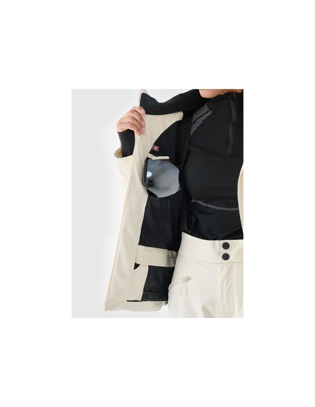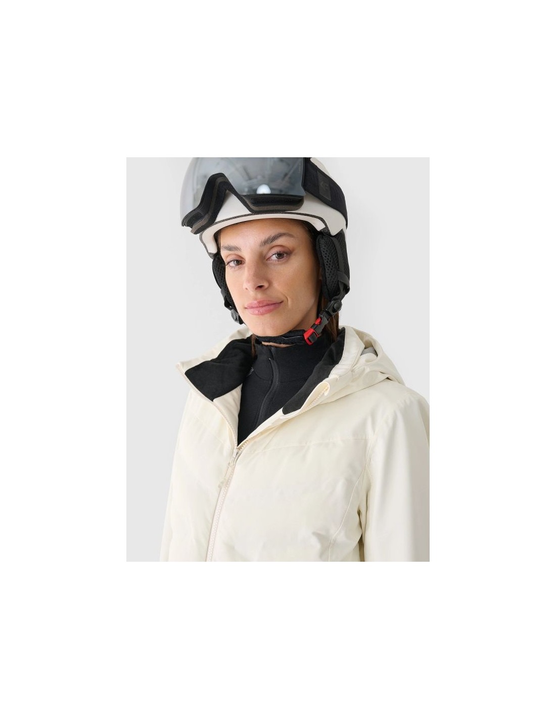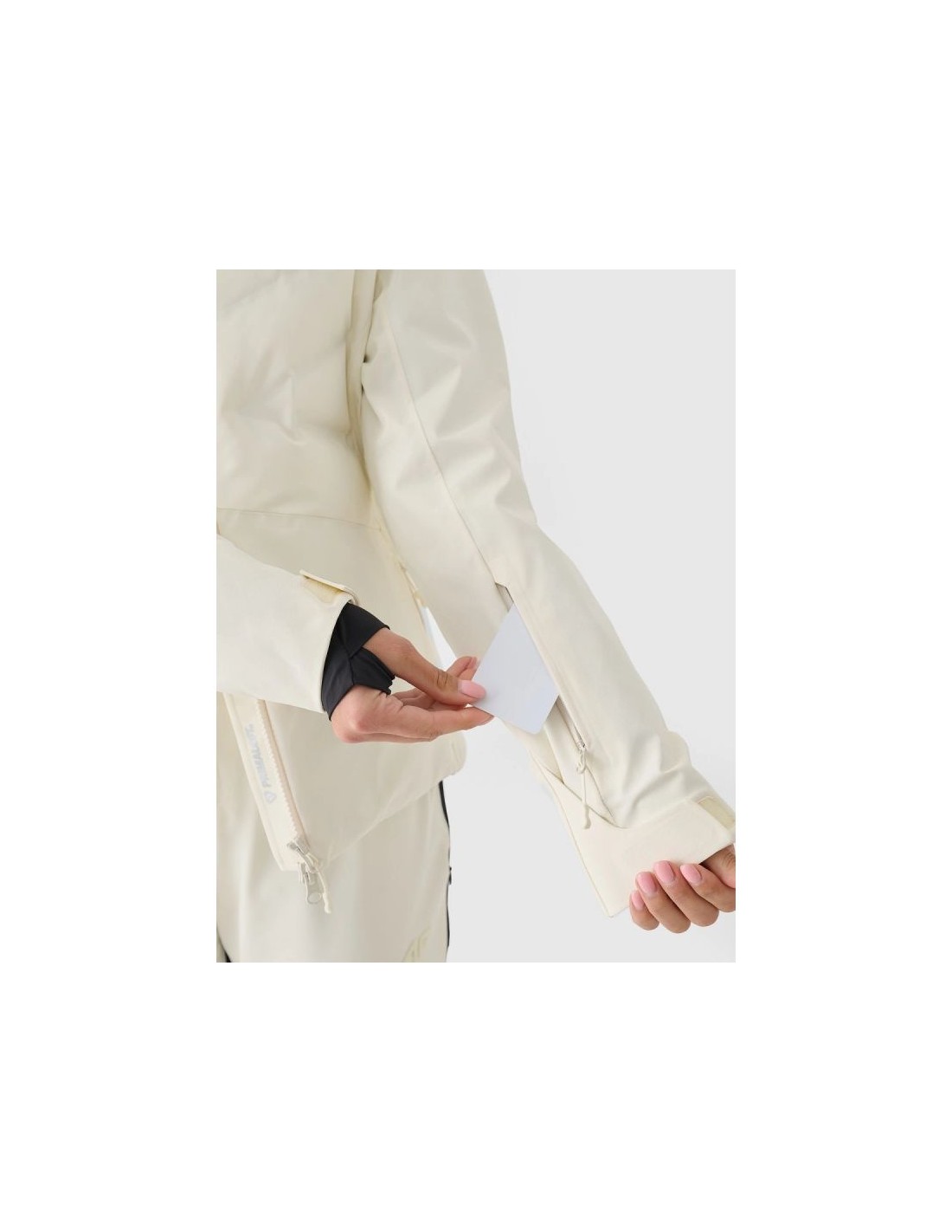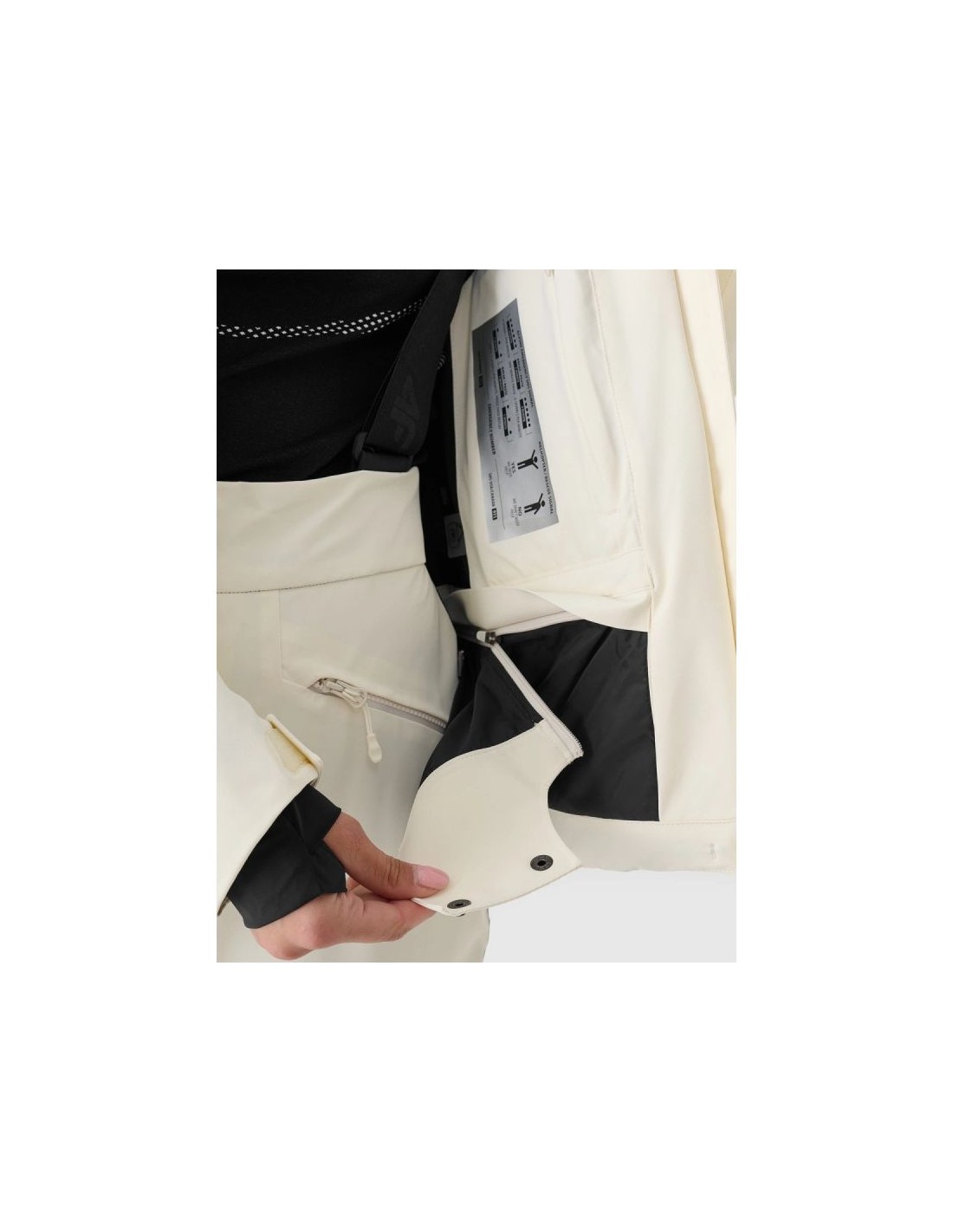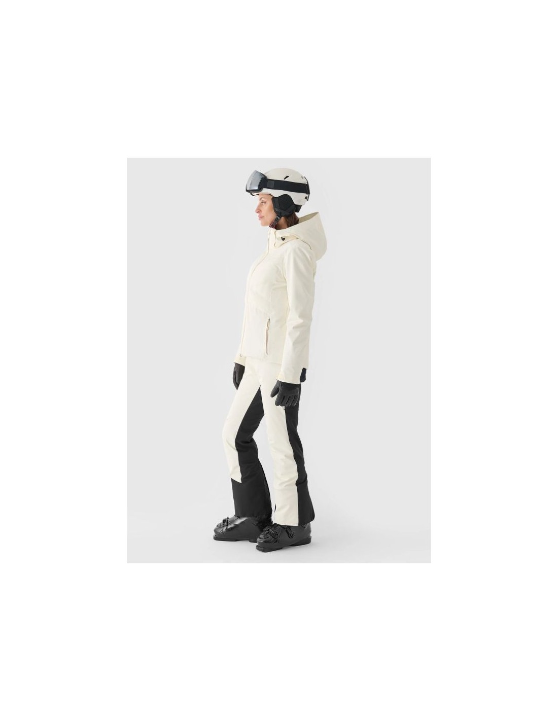 Women's 4F ski jacket with hood - Dermizax 20000, PrimaLoft The 4F women's ski jacket is a technologically advanced model designed for intense winter activities on the slopes. The regular cut and standard hip length ensure a comfortable fit and complete freedom of movement. The combination of a Dermizax 20,000 membrane , PrimaLoft insulation , and flexible 4Way Stretch material guarantees effective protection against wind, snow, and moisture, maintaining thermal comfort for long hours of skiing. This premium jacket is designed for women who expect maximum functionality and reliability in challenging weather conditions. PRODUCT FEATURES: Cut: regular, comfortably fitting to the figure Size range: XS–XXL Material: elastic 4Way Stretch Seams: fully taped, waterproof Coating: hydrophobic impregnation + Teflon Shield Insulation: PrimaLoft ThermoPlume (front/back panels) + PrimaLoft Silver Hood: detachable, with volume and depth adjustment Collar: high, lined with soft plush Cuffs: adjustable with Velcro + inner cuffs with thumb hole Ventilation: underarm, adjustable with a zipper Pockets: 2 side pockets with laminated zippers Internal pockets: goggle pocket + zipped pocket Main zipper: two-way, waterproof, with a wind flap Snow skirt: detachable, adjustable with snaps Battery Guard Pocket: With PrimaLoft insulation to protect your phone battery Extras: silicone elements on the shoulders for easier transport of skis Security: internal patch with SOS instructions PRODUCT PARAMETERS: Membrane: Dermizax 20000 Water resistance: 20,000 mm H2O Breathability: 10,000 g/m²/24h Filling: PrimaLoft ThermoPlume + PrimaLoft Silver (100% polyester)