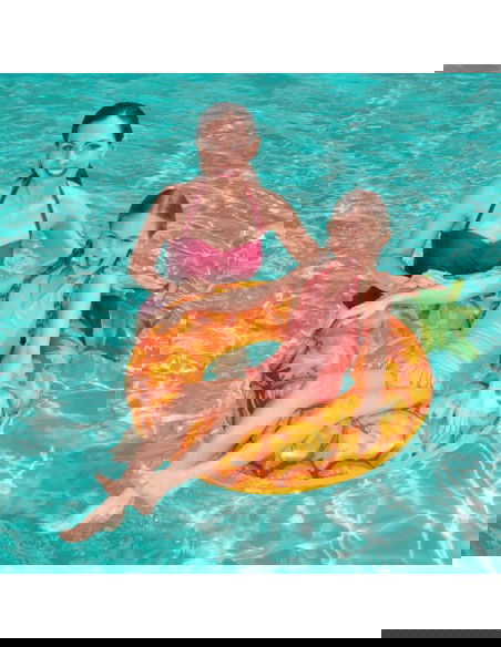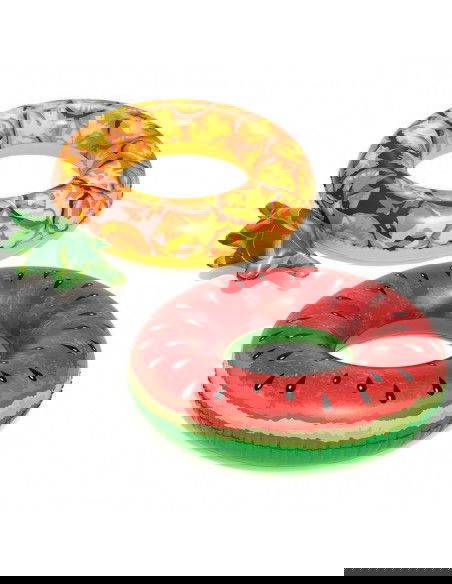 The Bestway inflatable swimming wheel captures the climate of a tropical vacation, no matter if you spend your vacation in the garden pool, by the lake or on the seaside beach. Fashionable, fruity patterns inspired by pineapple and watermelon. Vinyl resistant to mechanical damage and abrasions. Tight vent Repair patch included.