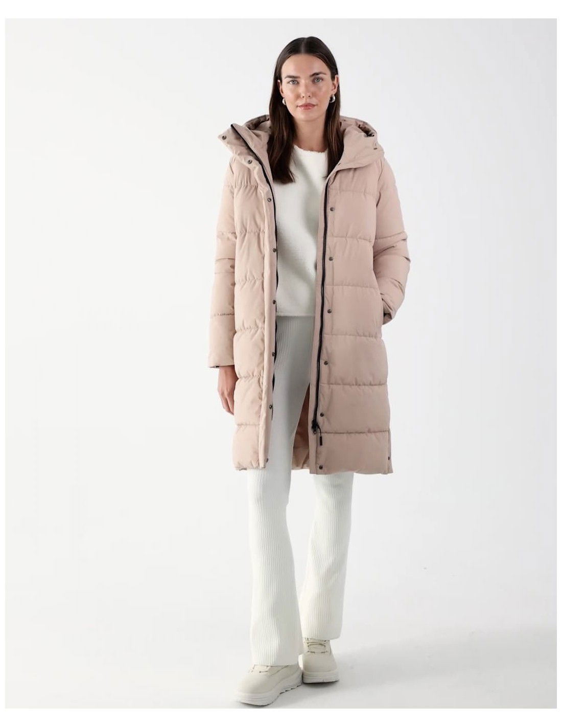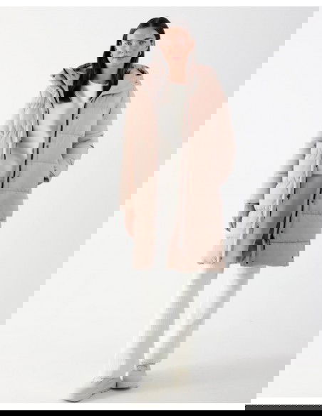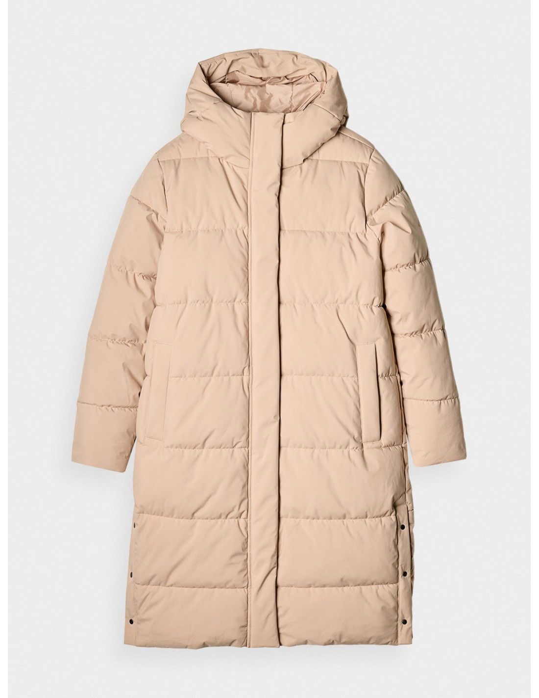 This women's winter down coat with increased volume and fill weight is the perfect choice for frosty winter days, whether for everyday or sports activities. It guarantees excellent protection against low temperatures while ensuring complete comfort in a variety of weather conditions. women's winter jacket coat 4F knee length the hydrophobic coating of the outer material limits the absorption of moisture integrated hood with volume and depth adjustment inner knit cuffs 2 side pockets with zipper closure internal, unfastened pocket two-way main zipper with inner and outer wind flaps side snap fastening at the bottom of the coat synthetic down filling provides adequate insulating properties even in humid conditions dominant material: polyester