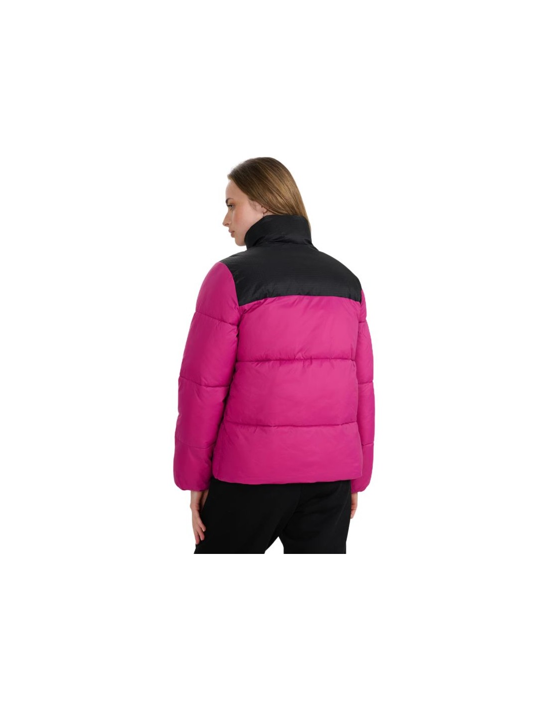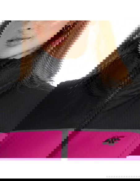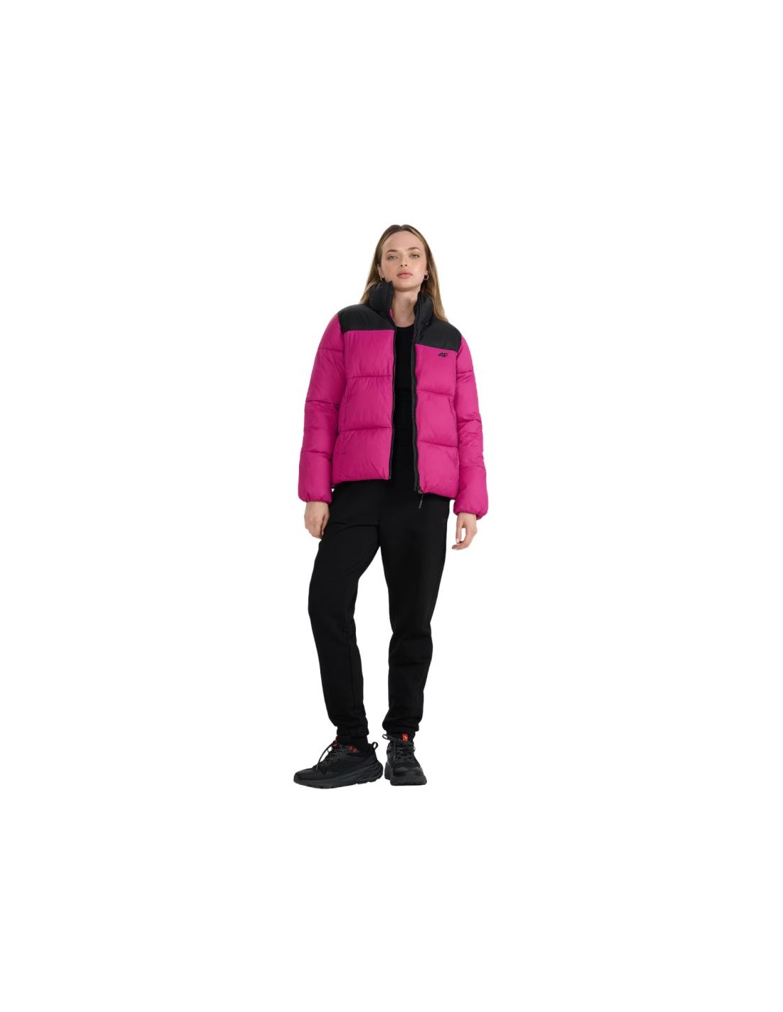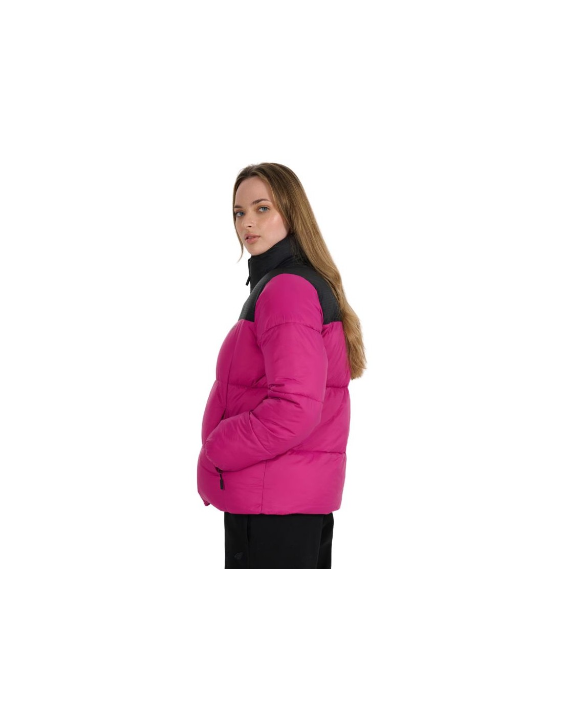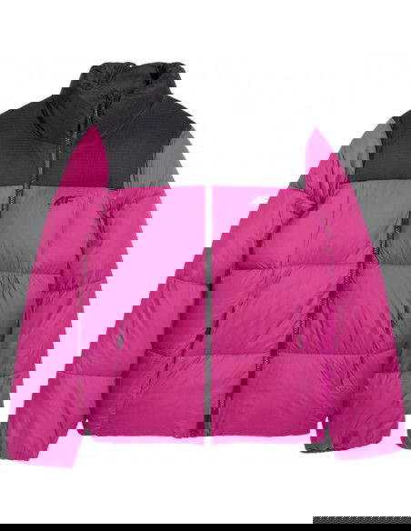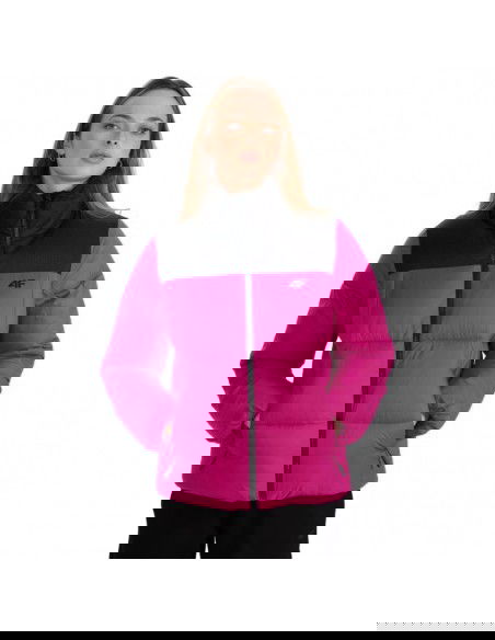 Women's down jacket 4F F581 fuchsia 4FWAW25TDJAF581 55S The 4F women's winter jacket with optimal filling weight is designed for colder days. Technical data: Main material: 100% polyester Lining: 100% polyester Lining 2: 100% polyester Filling: 100% polyester Regular fit - comfortable fit to the body without feeling uncomfortable · Standard hip length - a universal style for everyday wear Classic horizontal quilting - aesthetic appearance and even distribution of insulation Smooth polyester lining - comfortable to wear and easy to put on Designed for colder days - effective protection against the cold · Hydrophobic outer coating - limits moisture absorption and increases protection against rain · High collar - additional neck protection against the wind 2 side zippered pockets - safe storage of the most necessary things · One-way zipper with a wind flap - limits the penetration of cold air · Adjustable bottom with a stopper - better fit and protection against wind · Rip stop panel - durable, tear-resistant fabric with a reinforced structure · Synthetic filling - effective thermal insulation even in humid conditions