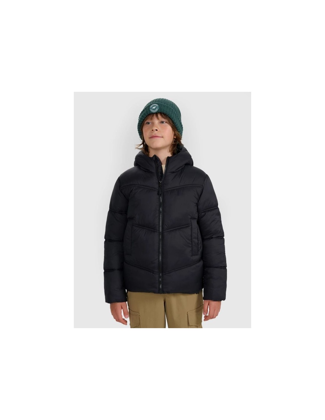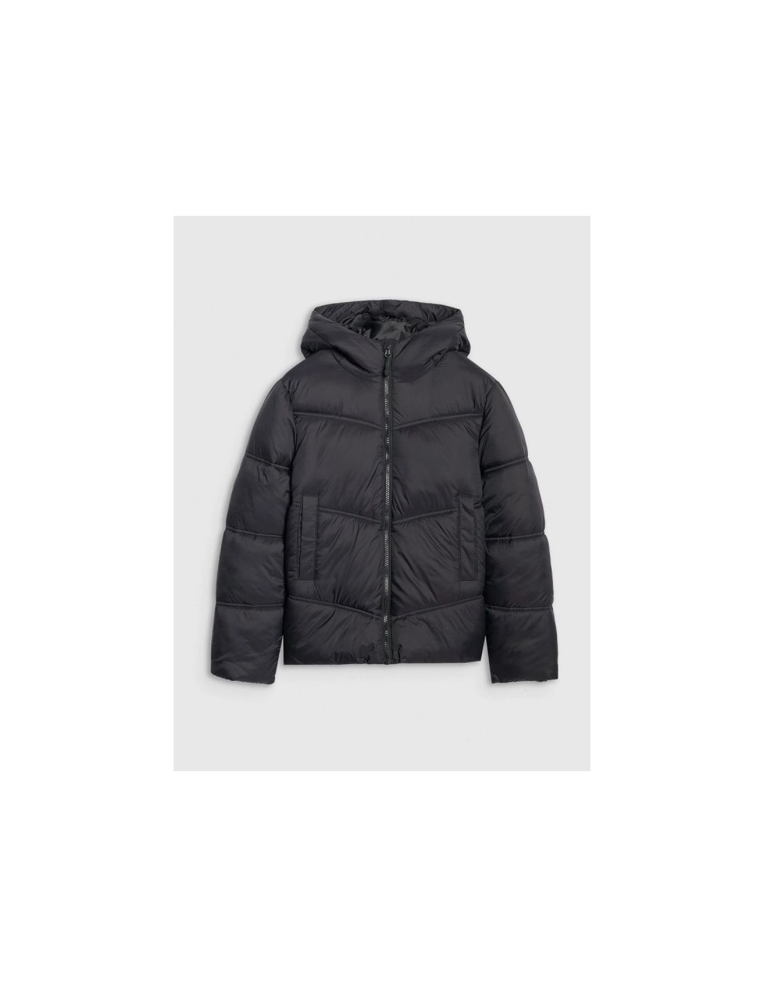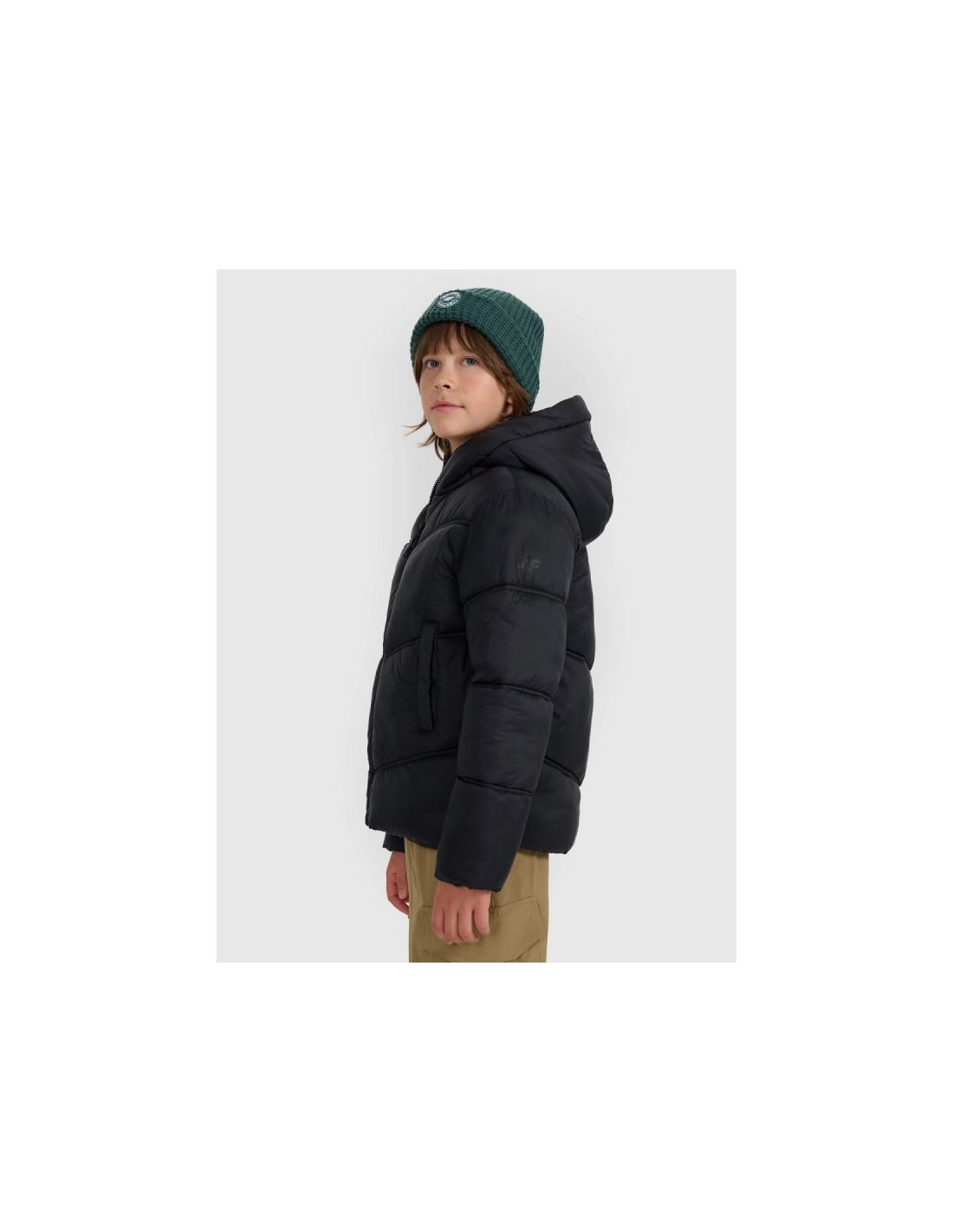 Boys' down jacket with synthetic filling - warmth and lightness for cold days This boys' down jacket is designed for everyday wear in the colder seasons. Synthetic insulation provides warmth without excess bulk, making it lightweight and comfortable to wear. CHARACTERISTICS: Cut – regular, guarantees freedom of movement. Intended use – for school, everyday use, walks and light outdoor activities. Technology – 4FWarm supports maintaining thermal comfort at lower temperatures. Filling – synthetic, light, easy to care for. Hydrophobic coating – limits the absorption of moisture into the material. Functional details – hood, full zip with chin guard, side pockets, elastic cuffs and hem. Composition – outer material: polyester; filling: synthetic. Weight – standard insulation suitable for the transitional season and light winter. This model is perfect as an outer layer on cold days. Paired with a sweatshirt or fleece, it provides additional warmth. The black color makes the jacket versatile and easy to match with various styles. Check also: jackets and vests for boys , pants for boys , 4FWarm