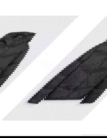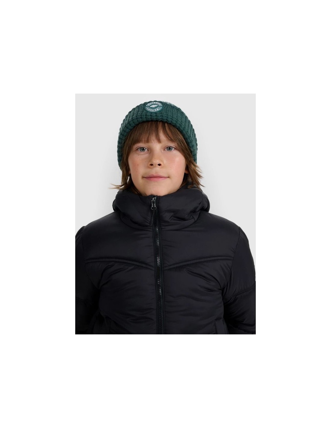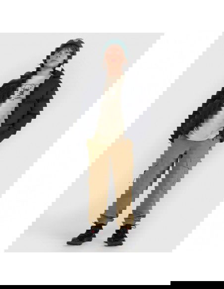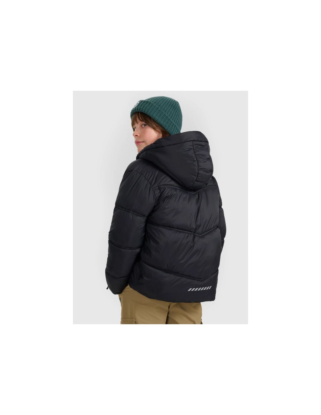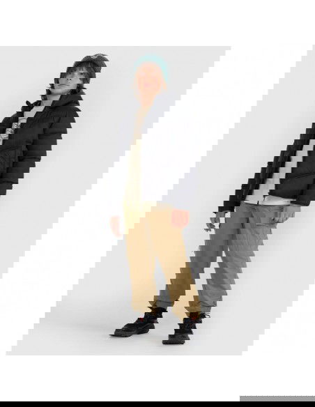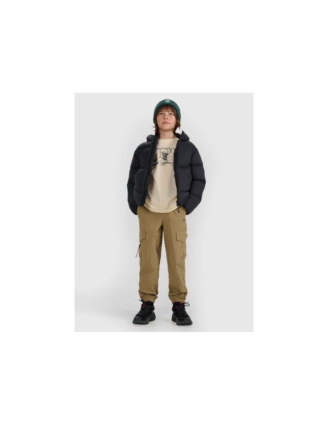Boys' down jacket with synthetic filling - warmth and lightness for cold days This boys' down jacket is designed for everyday wear in the colder seasons. Synthetic insulation provides warmth without excess bulk, making it lightweight and comfortable to wear. CHARACTERISTICS: Cut – regular, guarantees freedom of movement. Intended use – for school, everyday use, walks and light outdoor activities. Technology – 4FWarm supports maintaining thermal comfort at lower temperatures. Filling – synthetic, light, easy to care for. Hydrophobic coating – limits the absorption of moisture into the material. Functional details – hood, full zip with chin guard, side pockets, elastic cuffs and hem. Composition – outer material: polyester; filling: synthetic. Weight – standard insulation suitable for the transitional season and light winter. This model is perfect as an outer layer on cold days. Paired with a sweatshirt or fleece, it provides additional warmth. The black color makes the jacket versatile and easy to match with various styles. Check also: jackets and vests for boys , pants for boys , 4FWarm