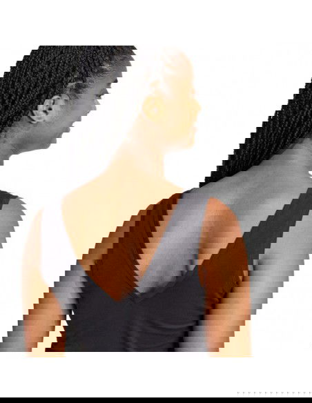 • Fitted, short cut with a deep neckline and cutout at the back.